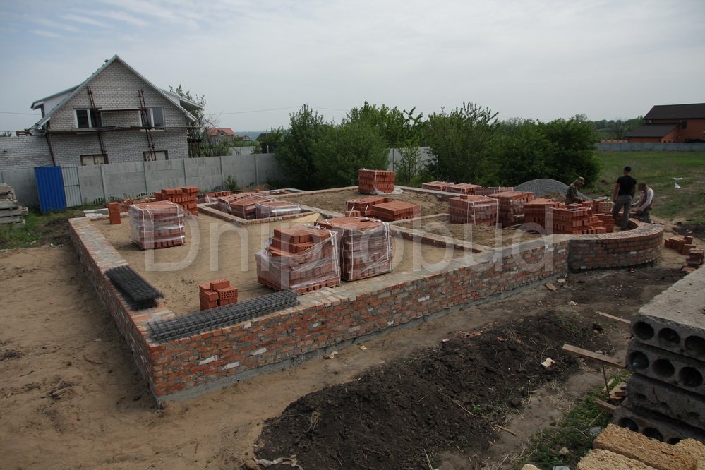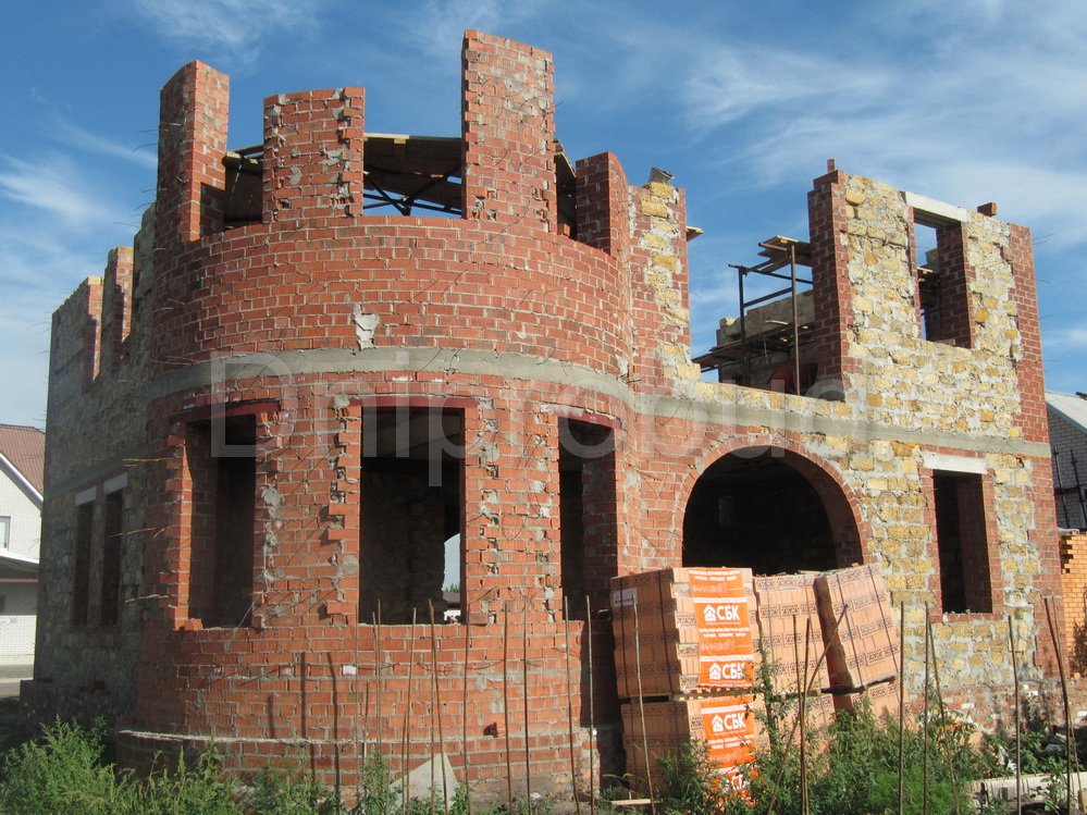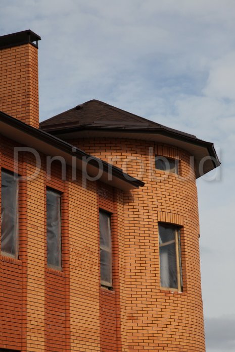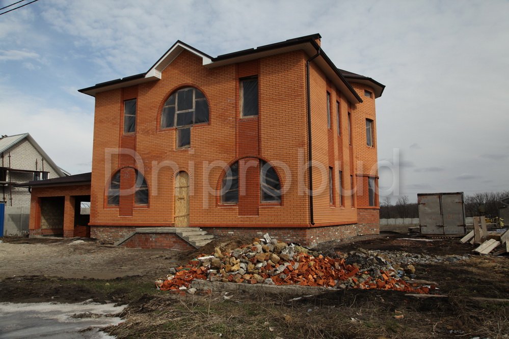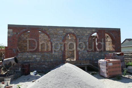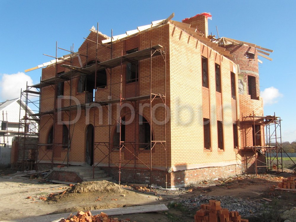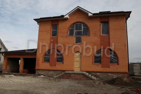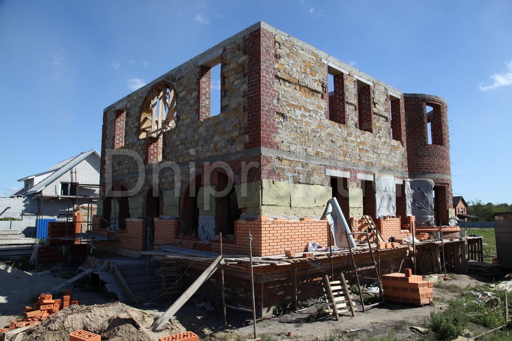 Строительство двухэтажного дома в Днепропетровске (с. Сажевка). Площадь 295 м.кв. Гараж на 2 авто, подвал. Большой круглый эркер. Арочные окна. Ракушечник 400 мм + 50 мм мин. вата + 120 мм керамический кирпич.