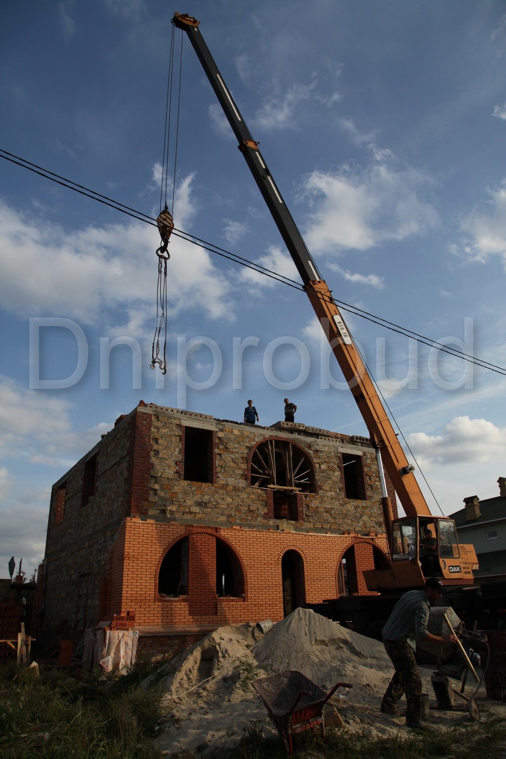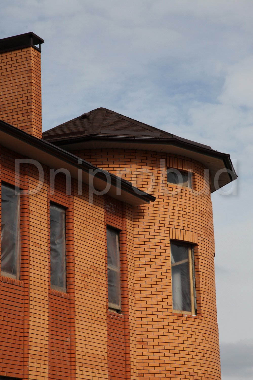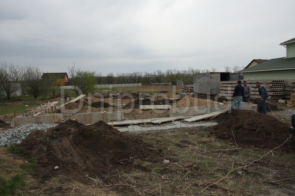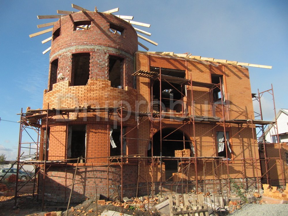 Строительство двухэтажного дома в Днепропетровске (с. Сажевка). Площадь 295 м.кв. Гараж на 2 авто, подвал. Большой круглый эркер. Арочные окна. Ракушечник 400 мм + 50 мм мин. вата + 120 мм керамический кирпич.