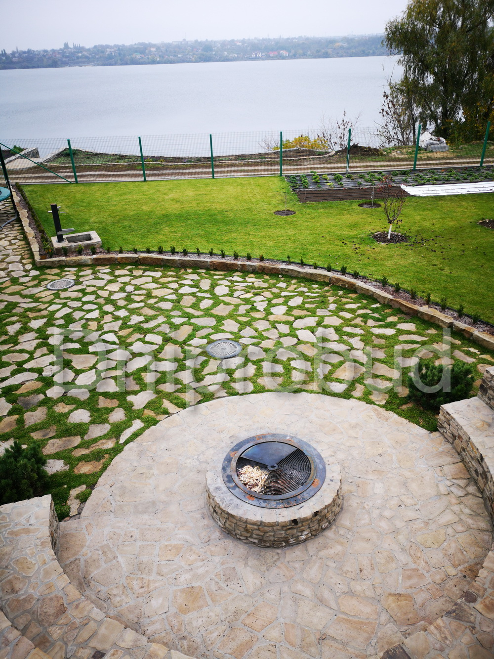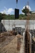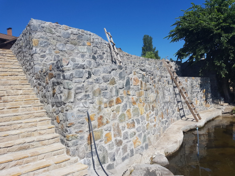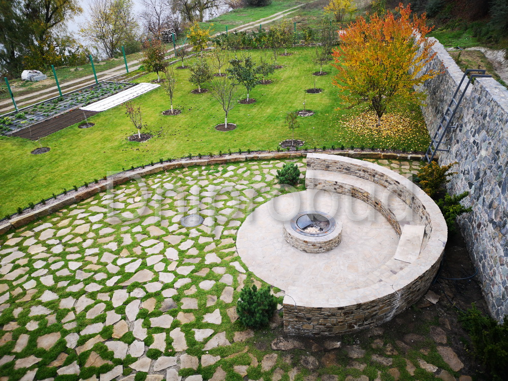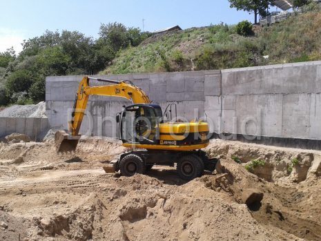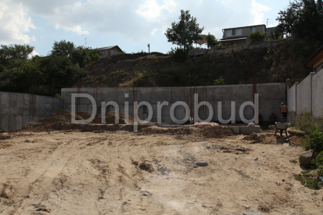 Участок расположен под высотой, которая сползает вниз. Демонтаж старых "укреплений склона". Фундамент стоит на гранитной плите (глубина залегания 0,5-2 м). Возведена массивная подпорная стена с дренажем и системой водоотведения.