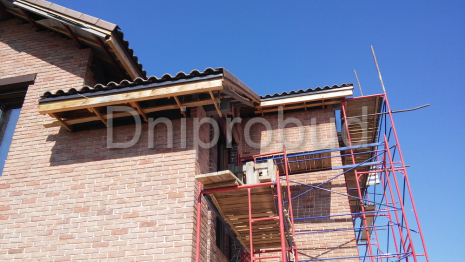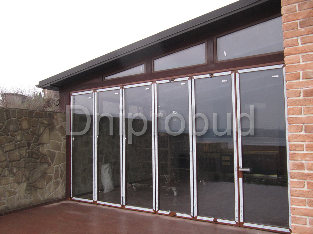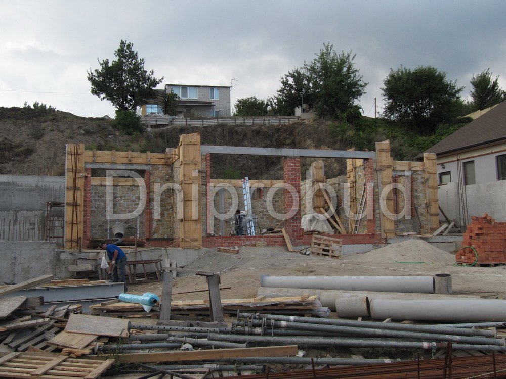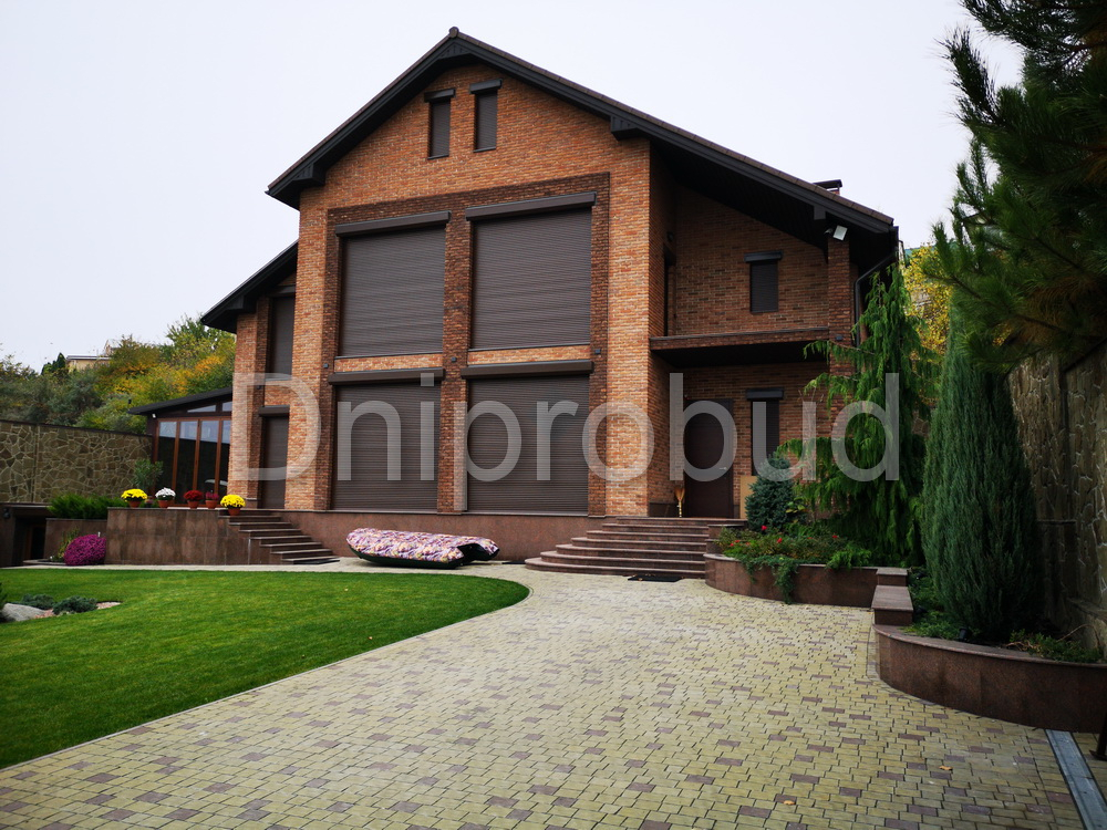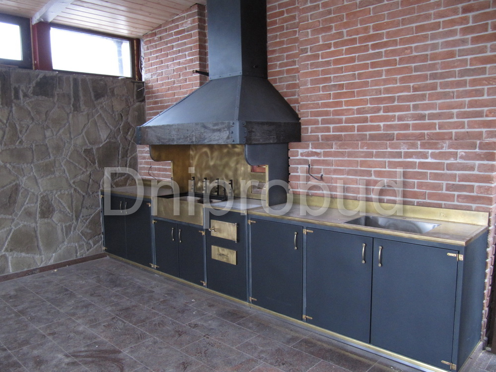 Слева от коттеджа специалистами компании Днипробуд был пристроен гараж для водного транспорта и, с помощью монолитного железобетонного перекрытия, большая крытая терраса с раздвижной системой дверей и большим медным барбекю.