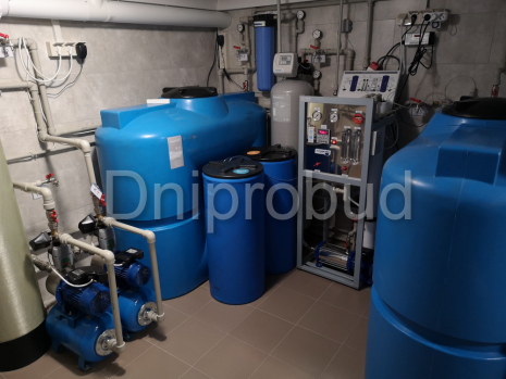 - Отопление: газовый котел, электрический котел, тепловой насос. Специалистами компании Днипробуд был максимально использован потенциал участка для электроснабжения, а именно: установлен тепловой насос «вода-вода» с «подключением» к р. Днепр.