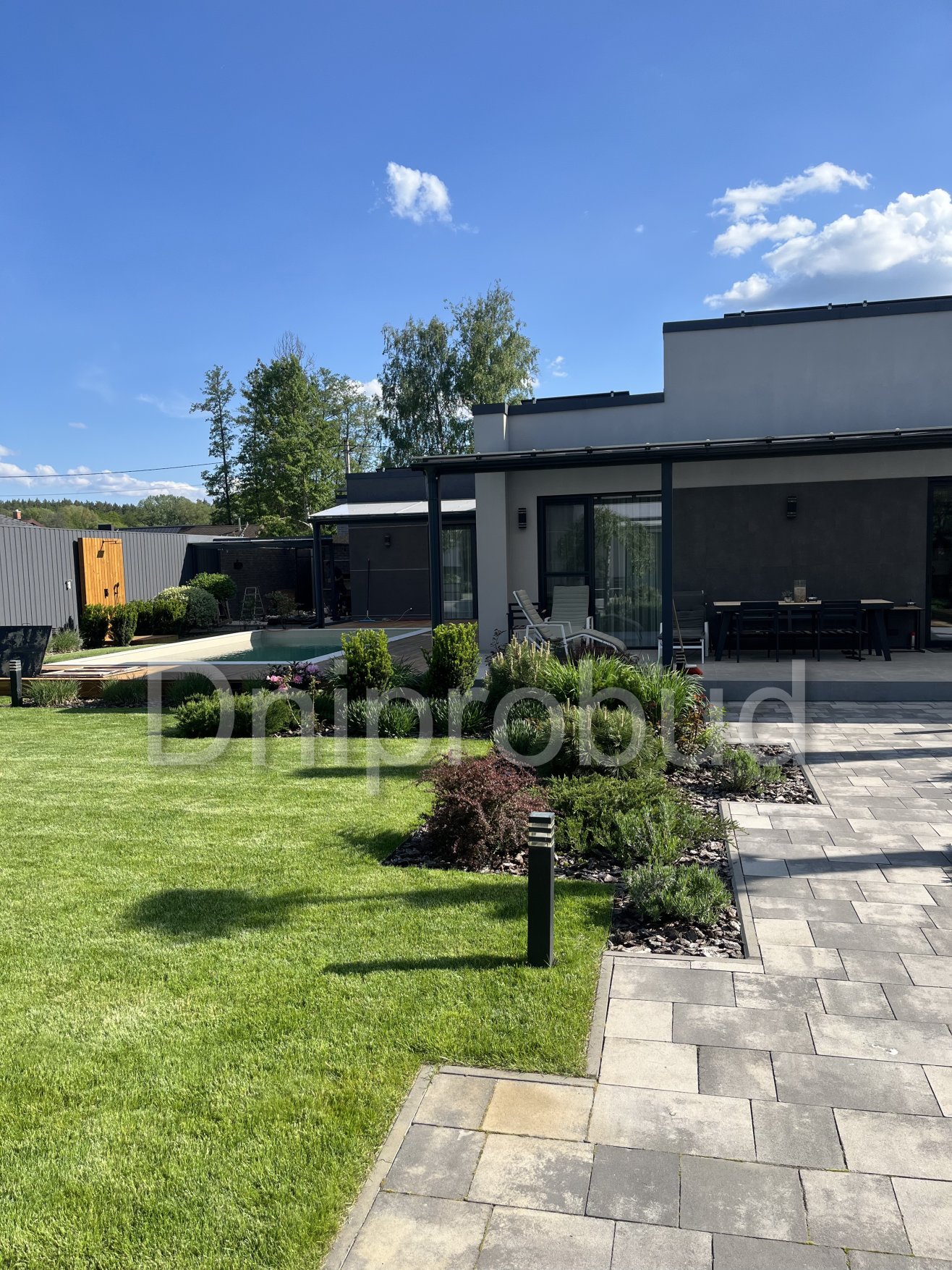 В связи с тем, что грунты на участке песчаные, для организации полива с оптимальным использованием воды частично был заменен песок под газоном на суглинок с трамбовкой. Очистка воды для использования в хозяйстве и оборудование для бассейна размещены в одном техническом помещении рядом с бассейном, что позволило оптимизировать трассы водоснабжения, включая подогрев воды в бассейне и подачу воды в гостевой дом.