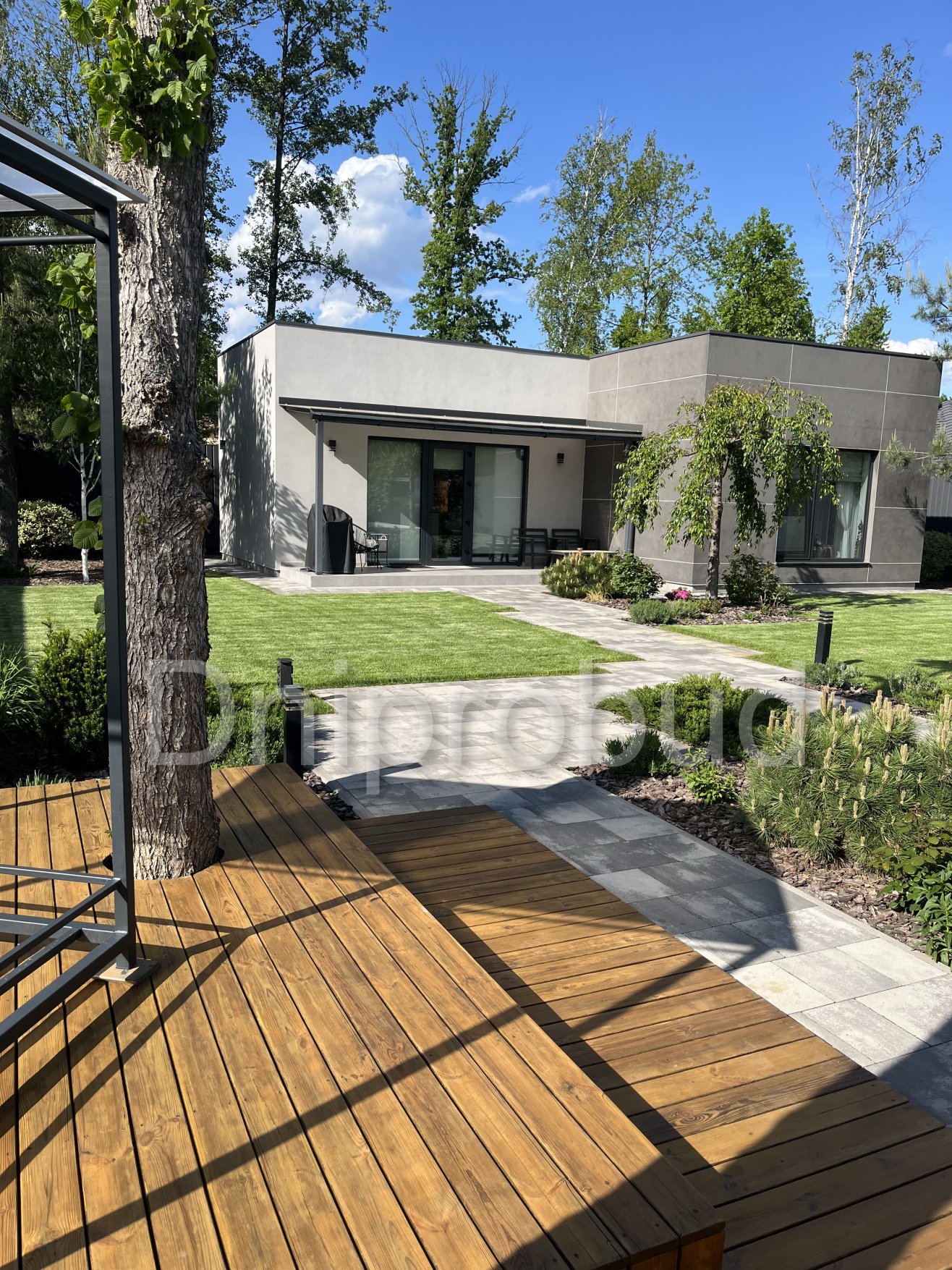 На участке максимально сохранены насаждения и организован полив под настилами зоны отдыха.