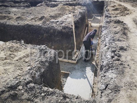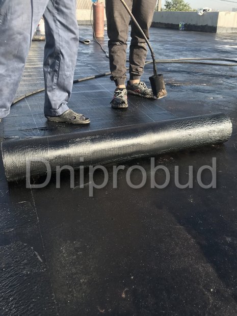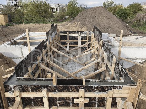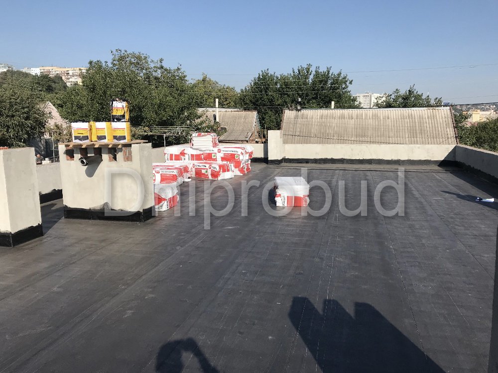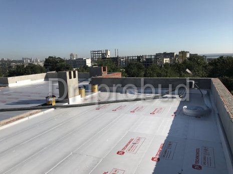 Фундамент - сборно-монолитный, ленточная железобетонная подушка+стены фундамента из блоков ФБС. Материал стен - керамический блок 2NF. Для устройства плоской кровли применяются плиты перекрытия. Устройство кровельного пирога включает: пароизоляцию еврорубероидом по праймеру, изготовление стяжки с разуклонкой, монтаж минеральной ваты 200 мм, укладку геотекстиля, монтаж ПВХ мембраны.