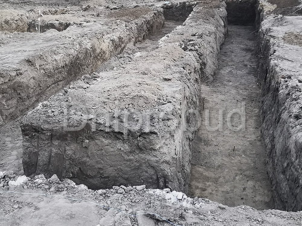 - Значительный перепад высот по участку, в совокупности с пожеланием заказчика о ровной террасе за домом, привёл к необходимости проведения объемных работ по трассированию земельного участка, а также сооружению цокольного этажа под частью дома в которой расположен бассейн.