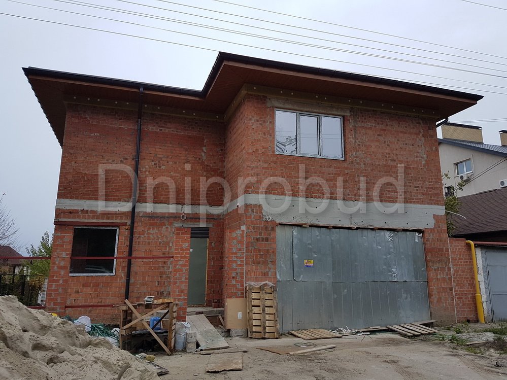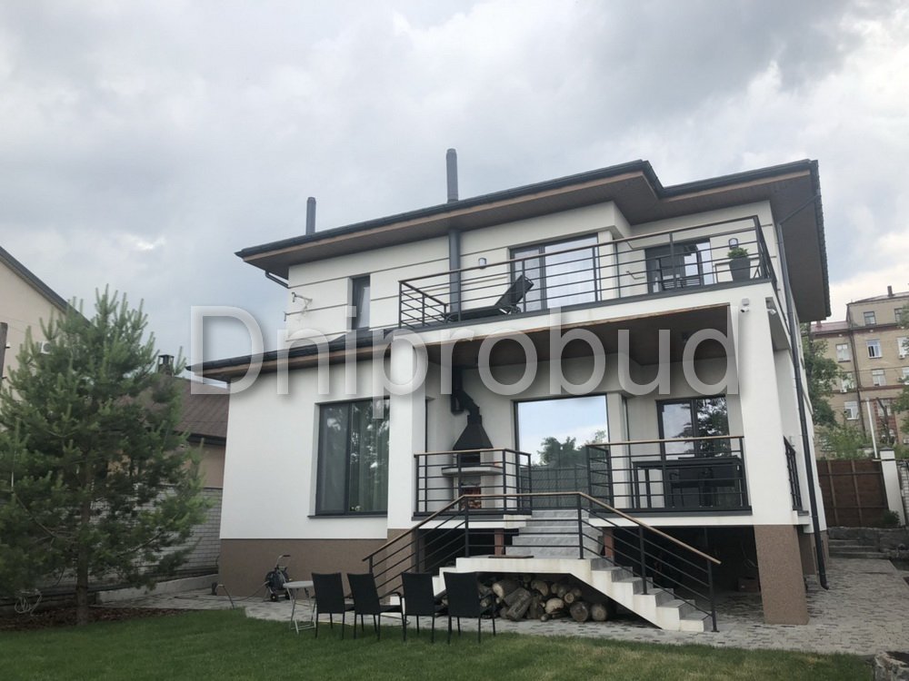 Большой современный дом с цокольным этажом, расположенный в Днепре. Строительство велось в районе плотной городской застройки на улице Сечевых Стрельцов по проекту DB 3.