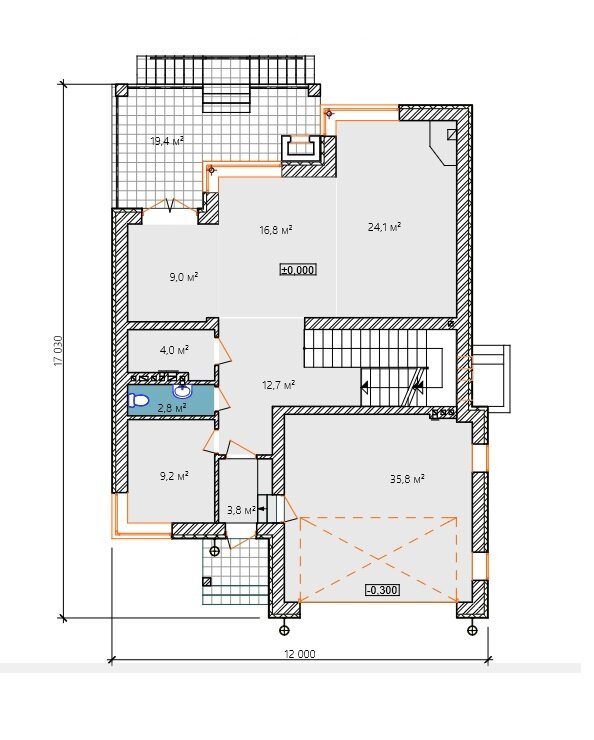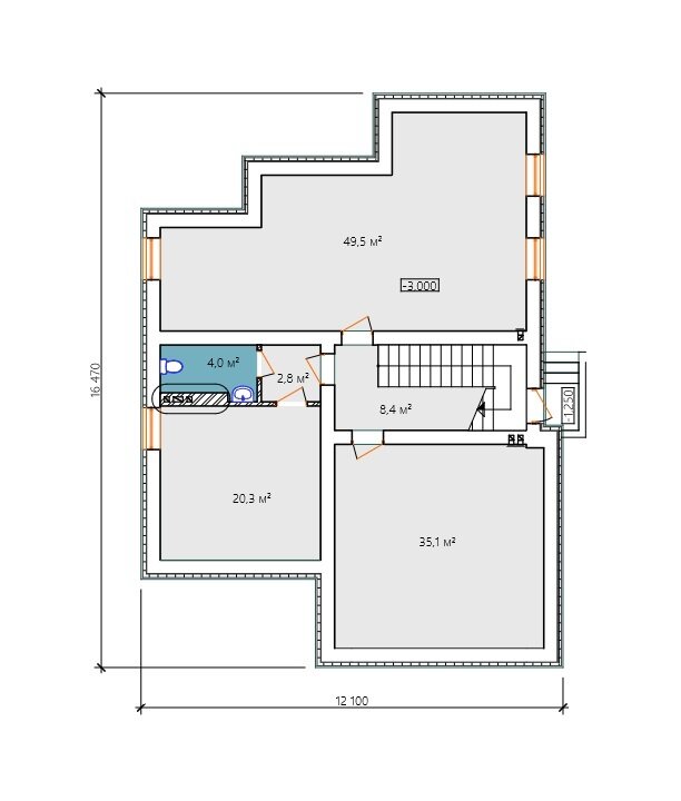 Для уменьшения площади, занимаемой домом, котельная, прачечная и хозяйственный блок были перенесены в цокольный этаж под гаражом. Также в цокольном этаже предусмотрен банный комплекс, который включает в себя парную, комнату отдыха и санузел.