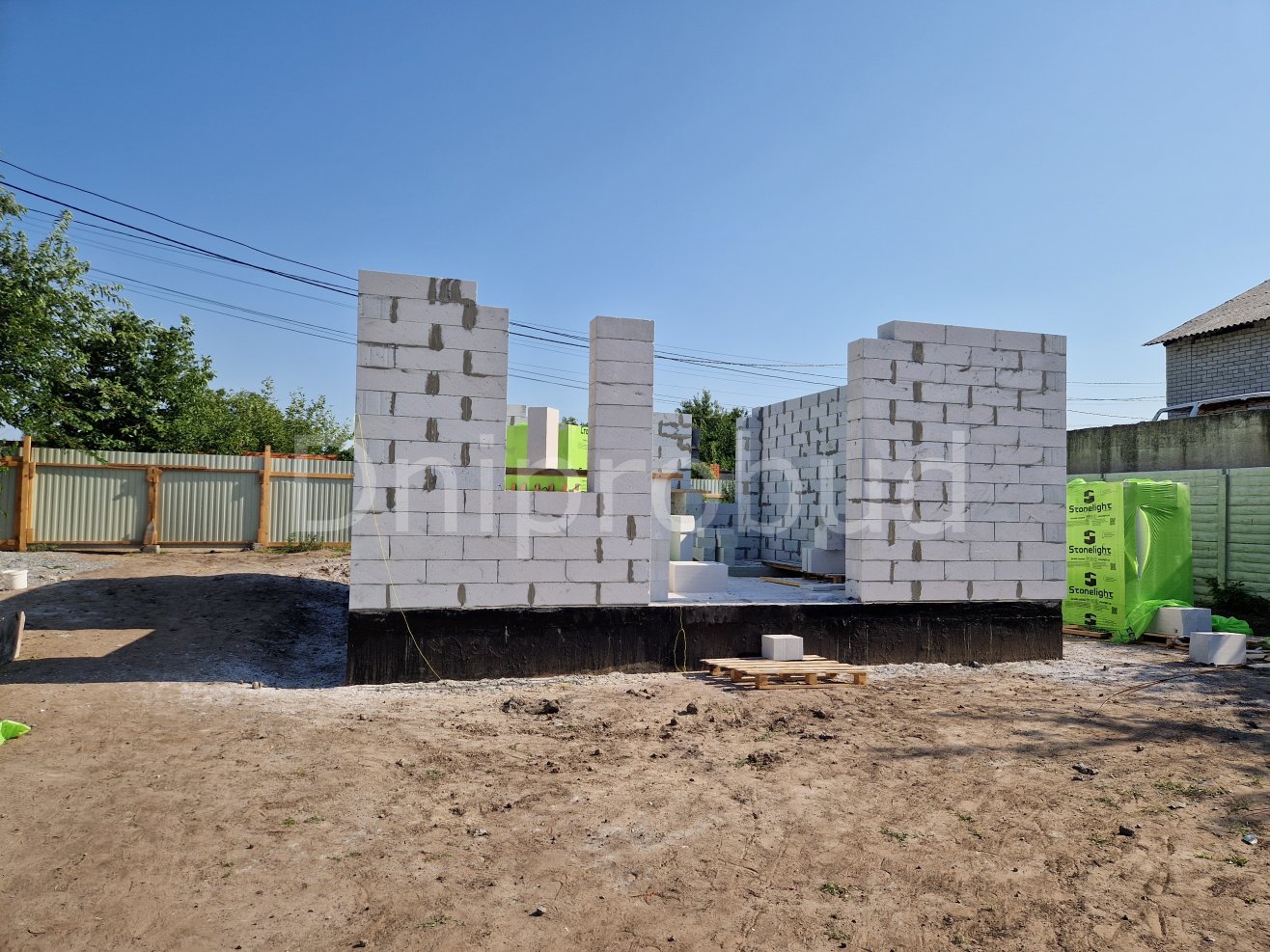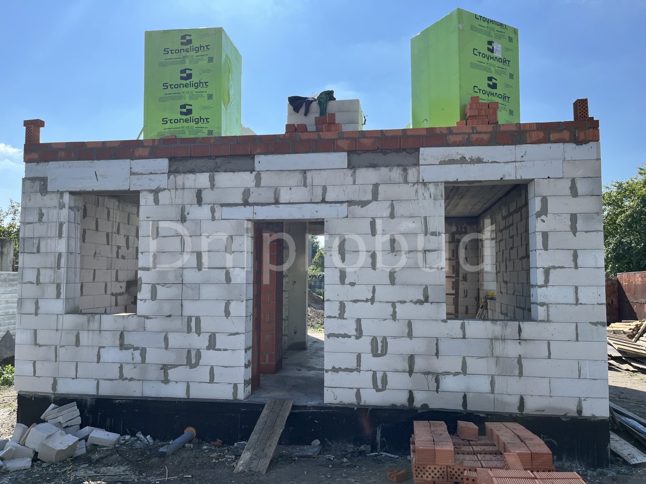 Стены выполнены из газобетона Stonelight толщиной 300 мм.