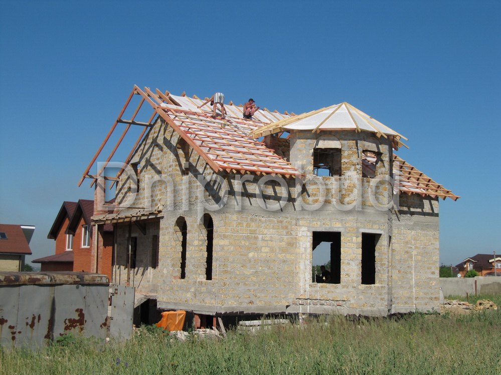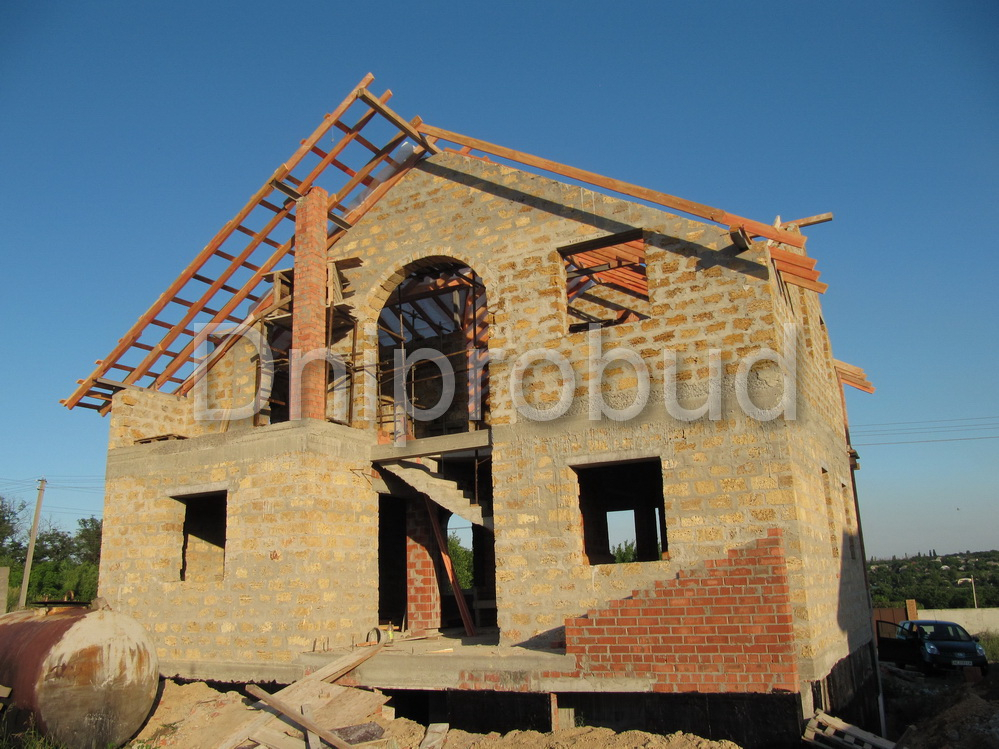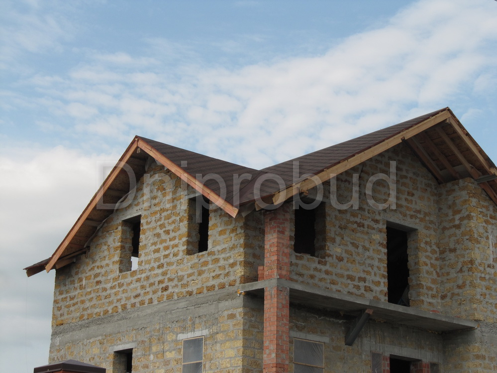 - Стены из ракушечника (ракушняк) 400 мм + 100 мм пенополистирола и декоративная штукатурка (утепленные стены и цоколь).