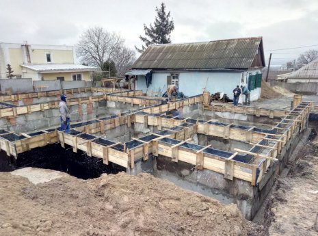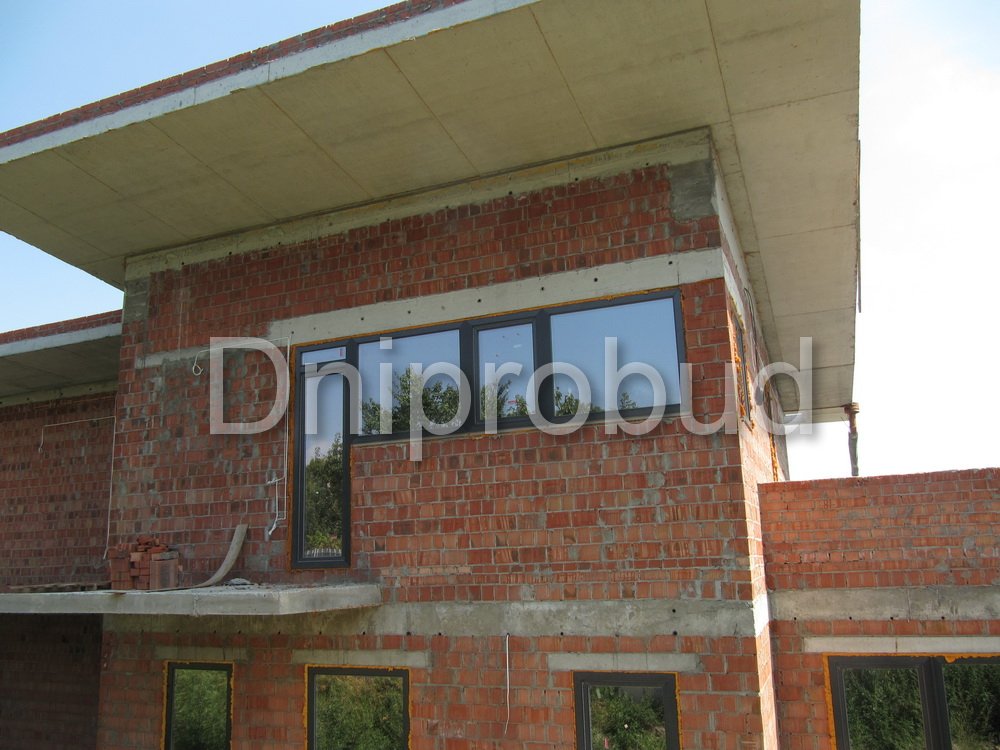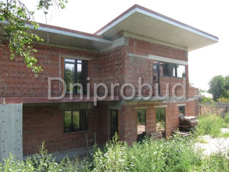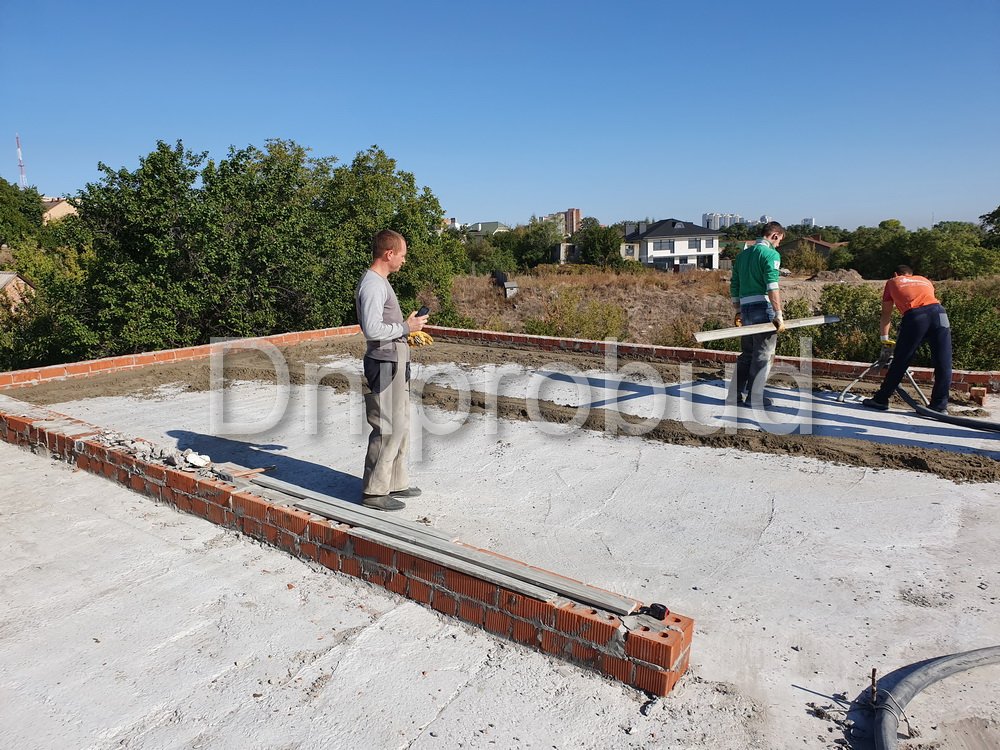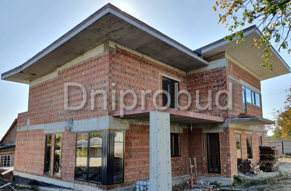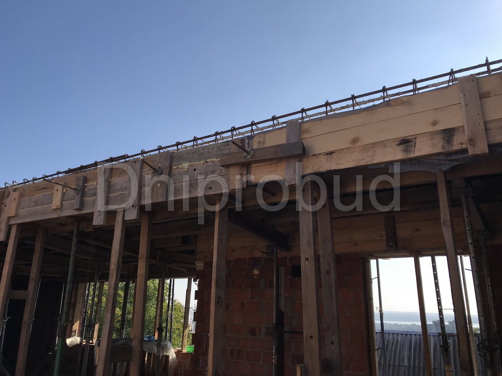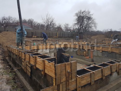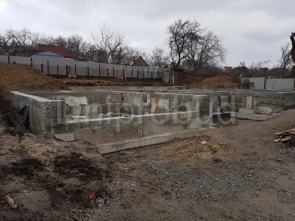 Особенности проекта: участок под строительство коттеджа находился на склоне с большим перепадом высот над яром, что вызвало необходимость возведения подпорной стены по всей территории, а также увеличения проектной высоты фундамента.
