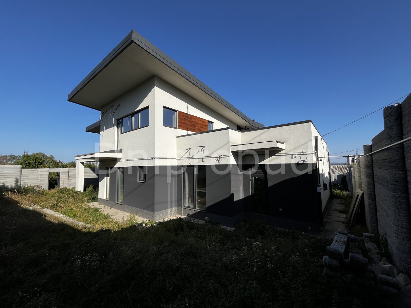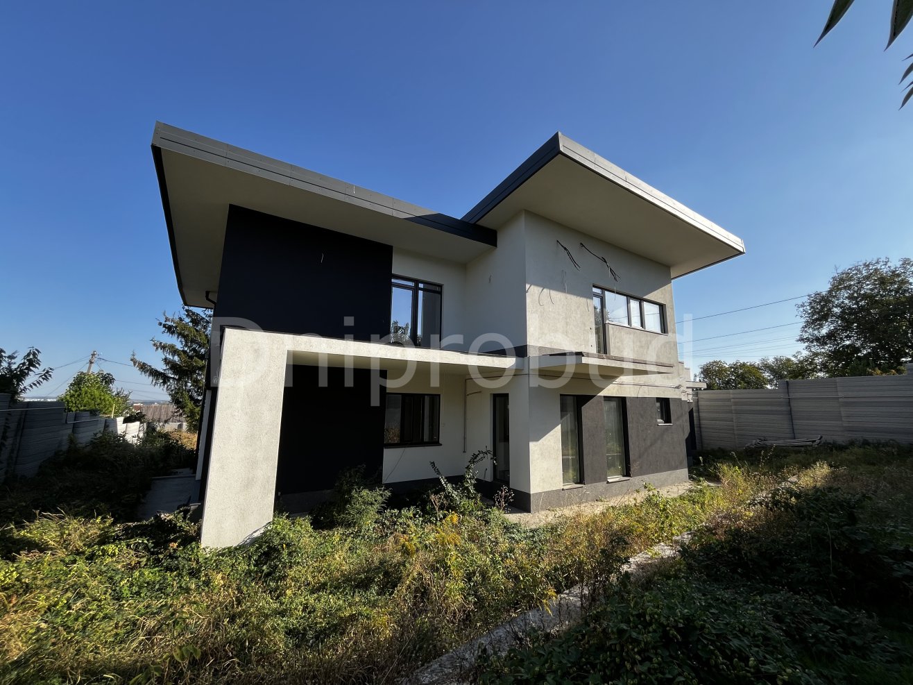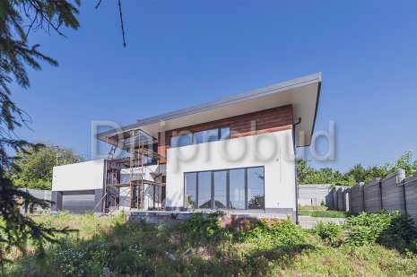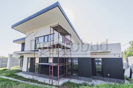 Современный двухэтажный дом с гаражом на две машины и просторной террасой, построенный по проекту UX22, адаптированному в соответствии с пожеланиями клиента и особенностями участка.