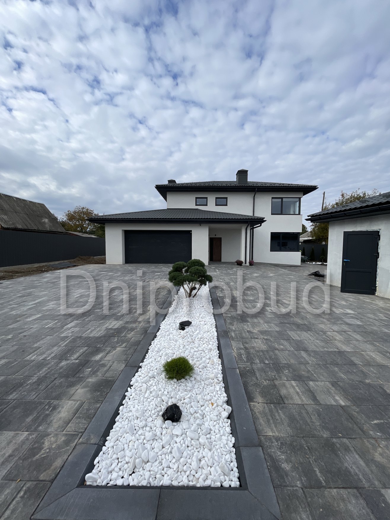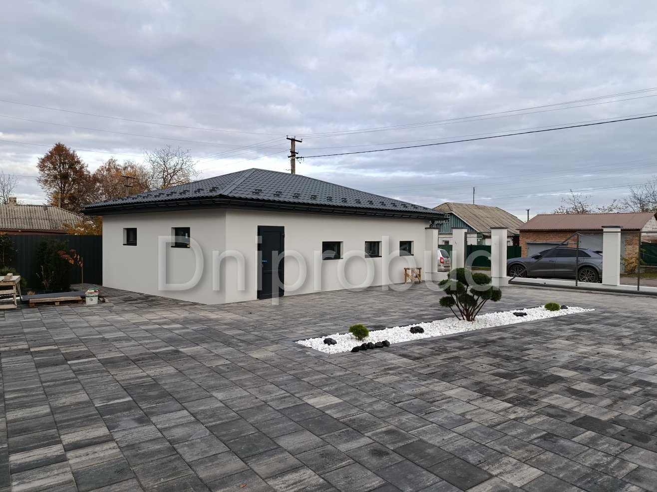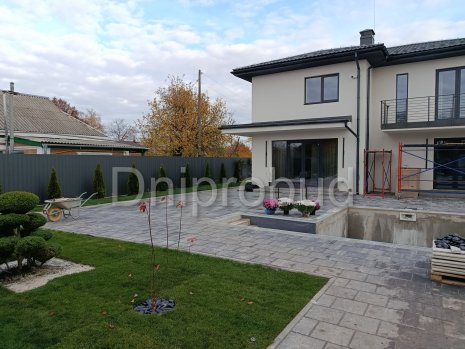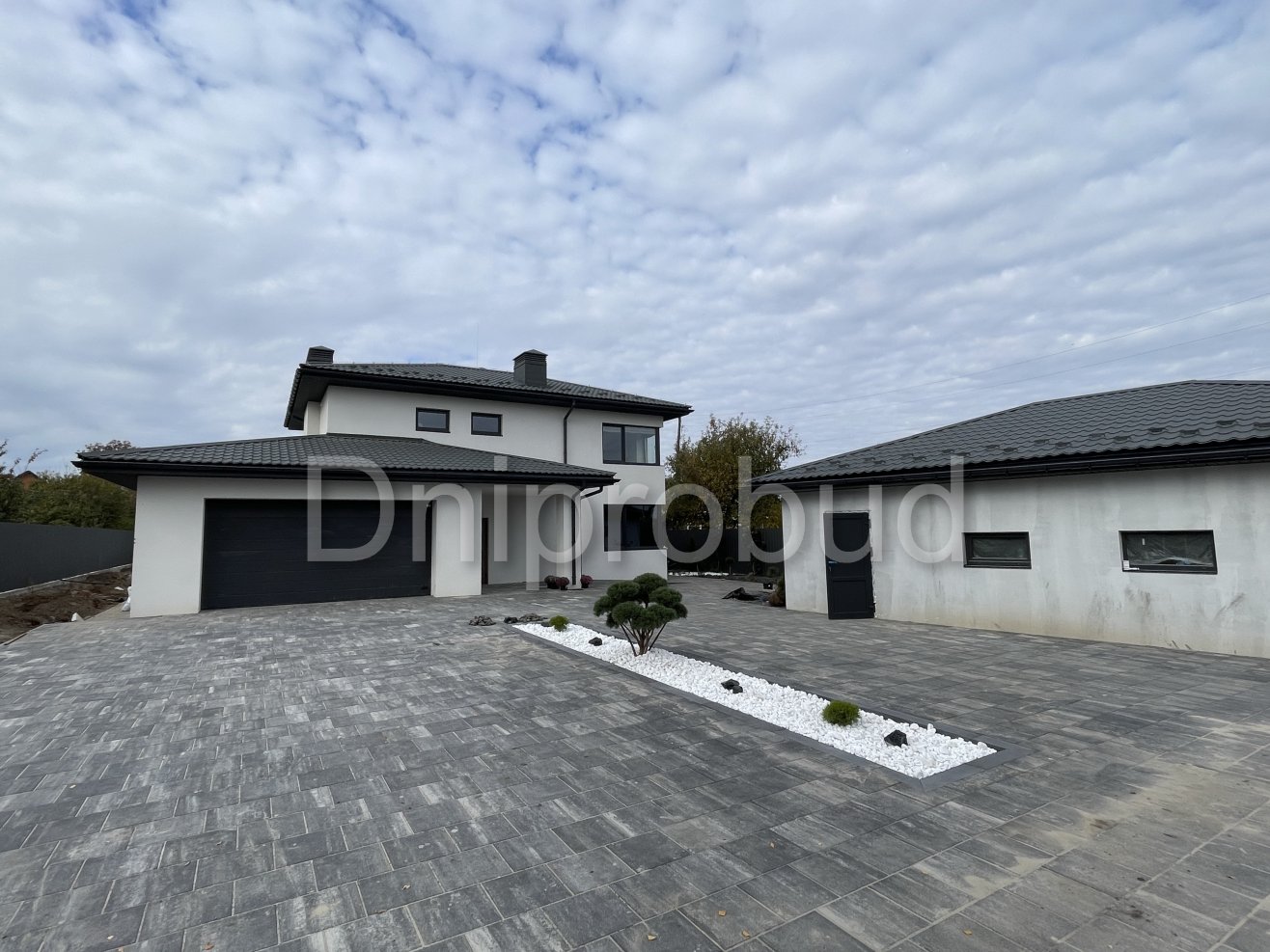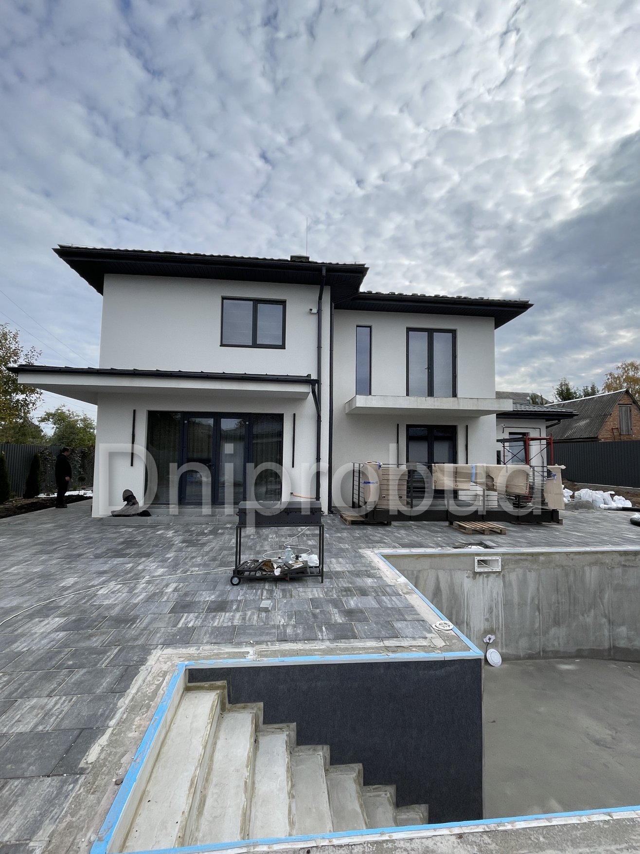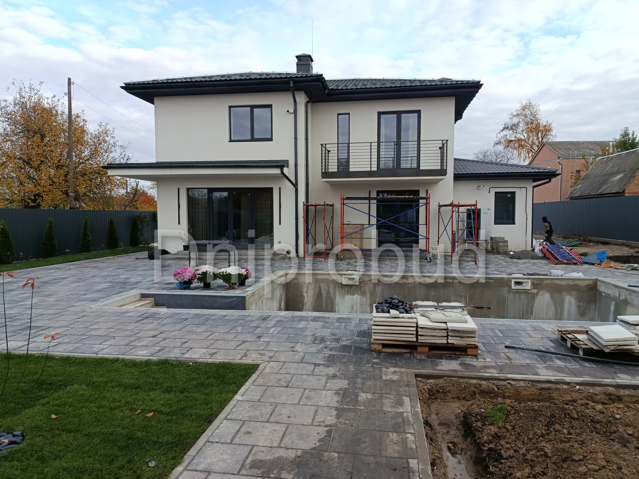 На участке также построены хозяйственное здание, беседка, бассейн, гараж на две машины.