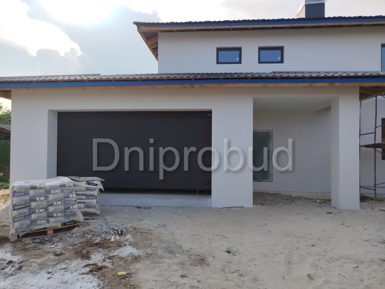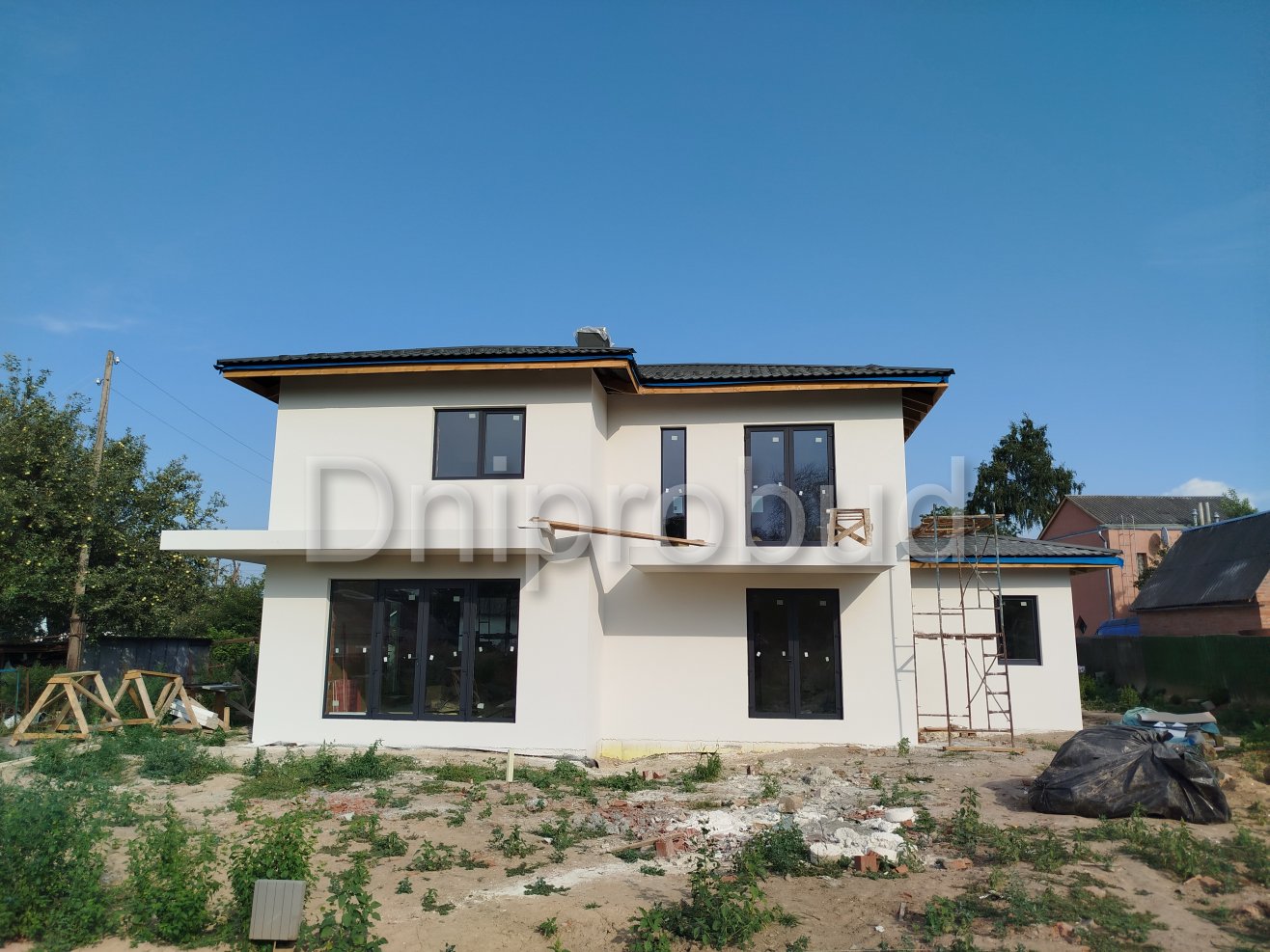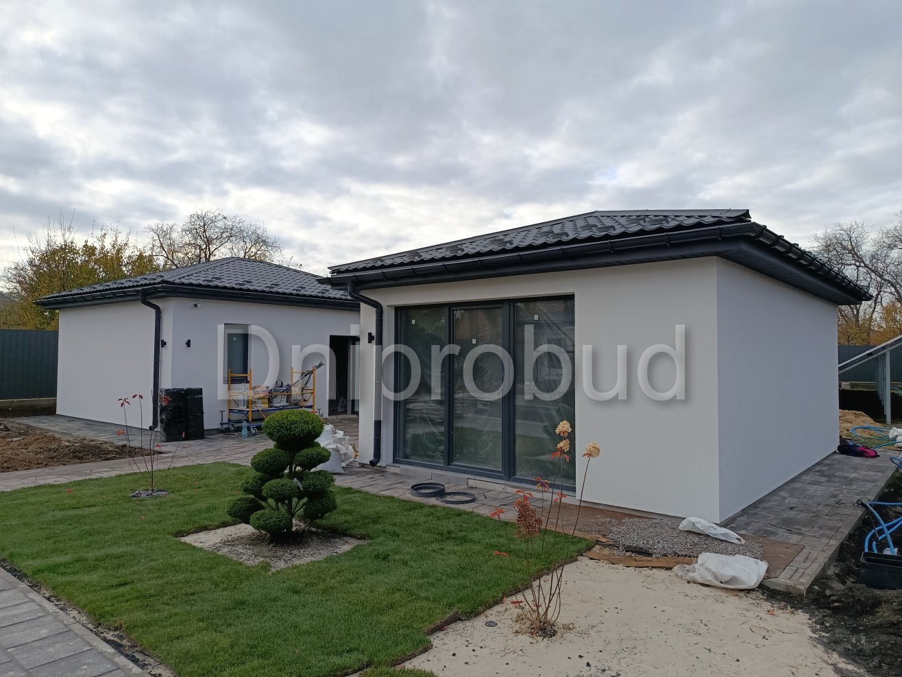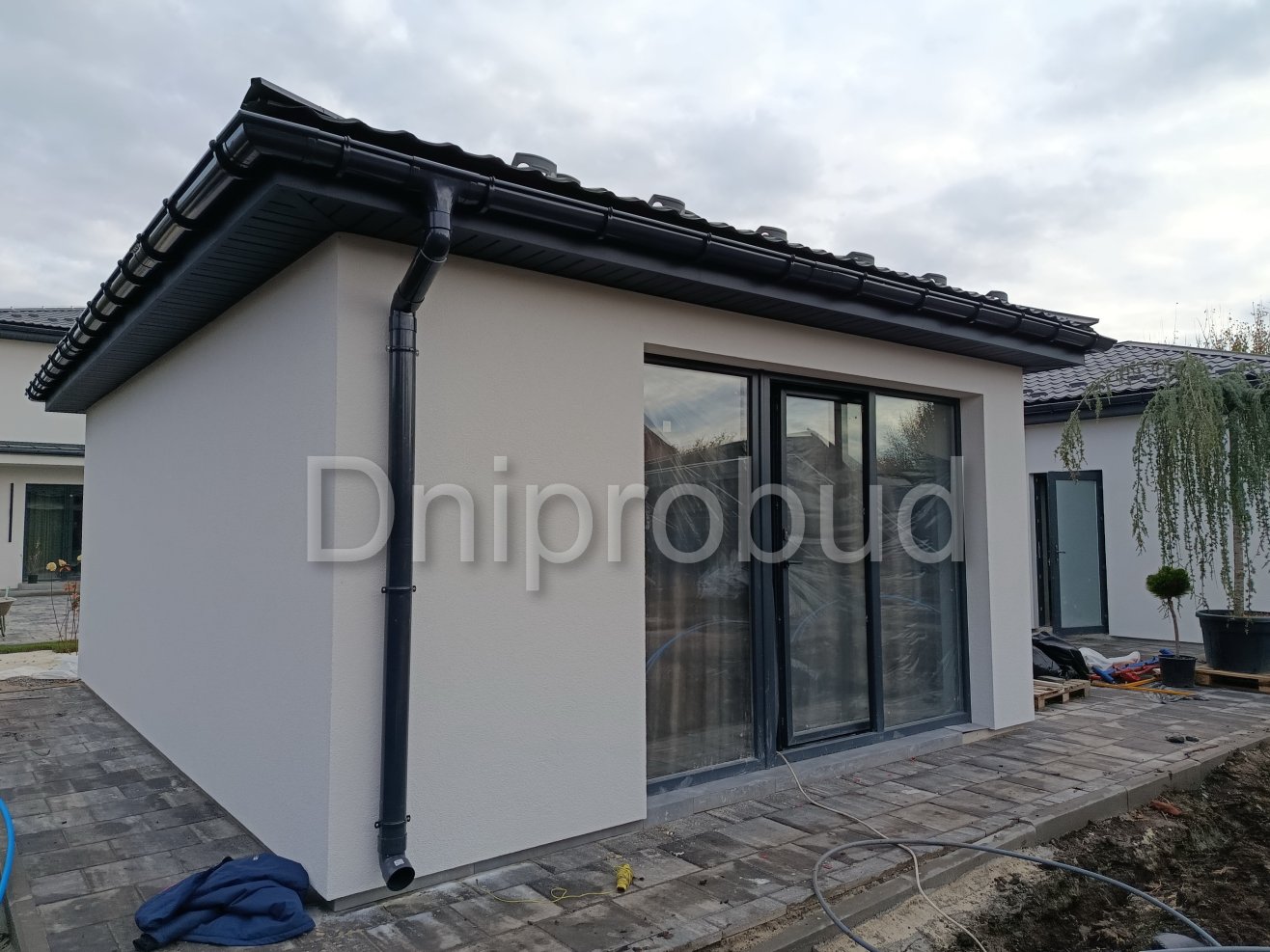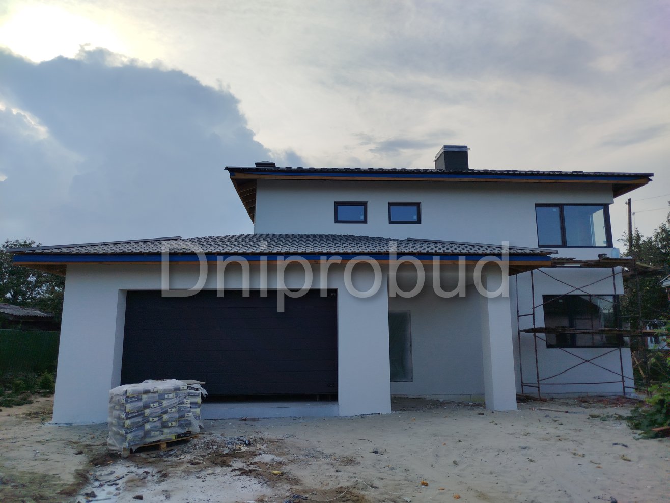 На участке также построены хозяйственное здание, беседка, бассейн, гараж на две машины.