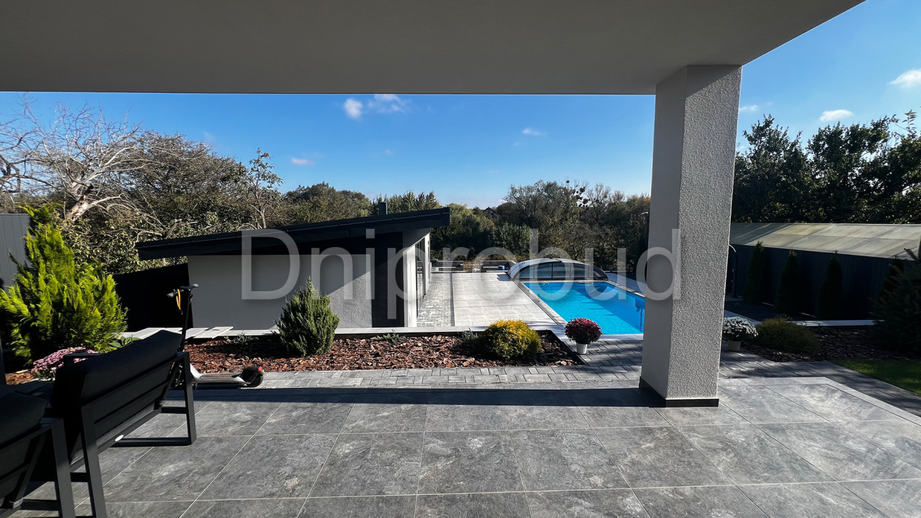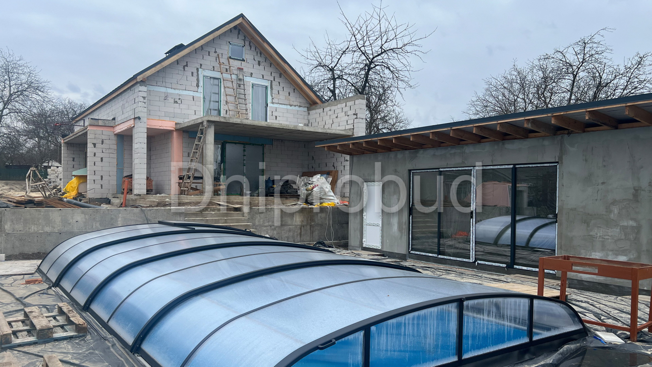 - Открытый бассейн. Бассейн выполнен с использованием несъёмной опалубки. Перепады глубин и лестница в бассейн сделаны из монолитного железобетона. Для продления сезона эксплуатации предусмотрена раздвижная павильонная система из поликарбоната.