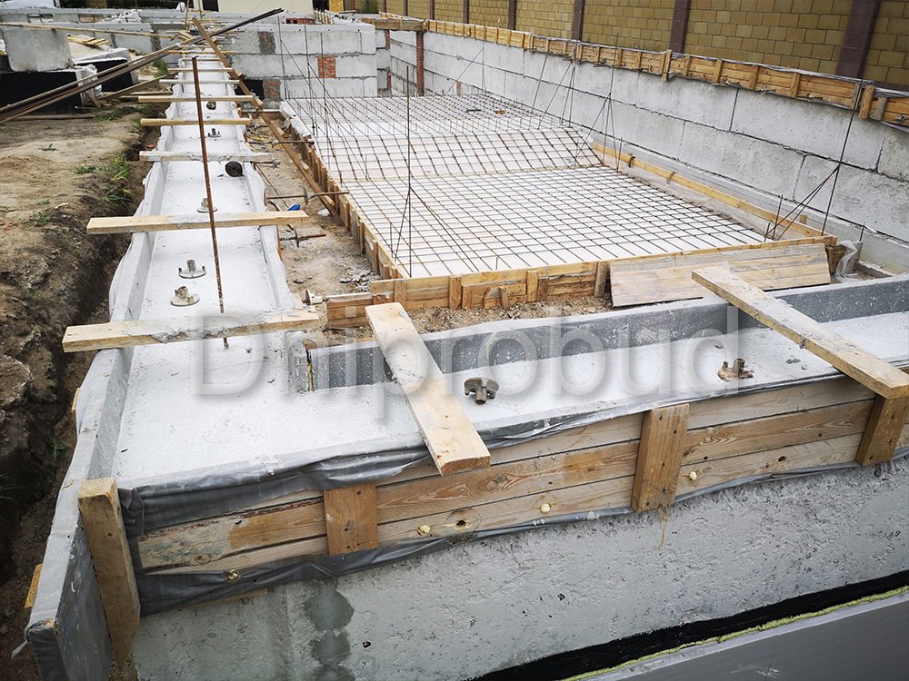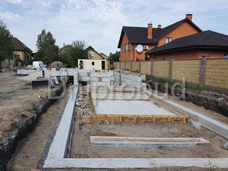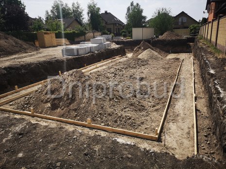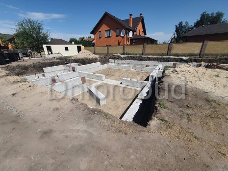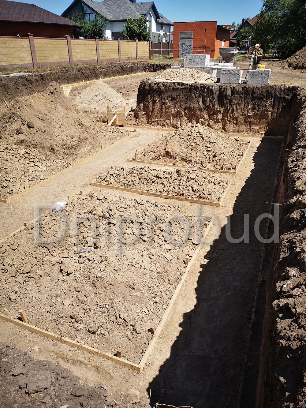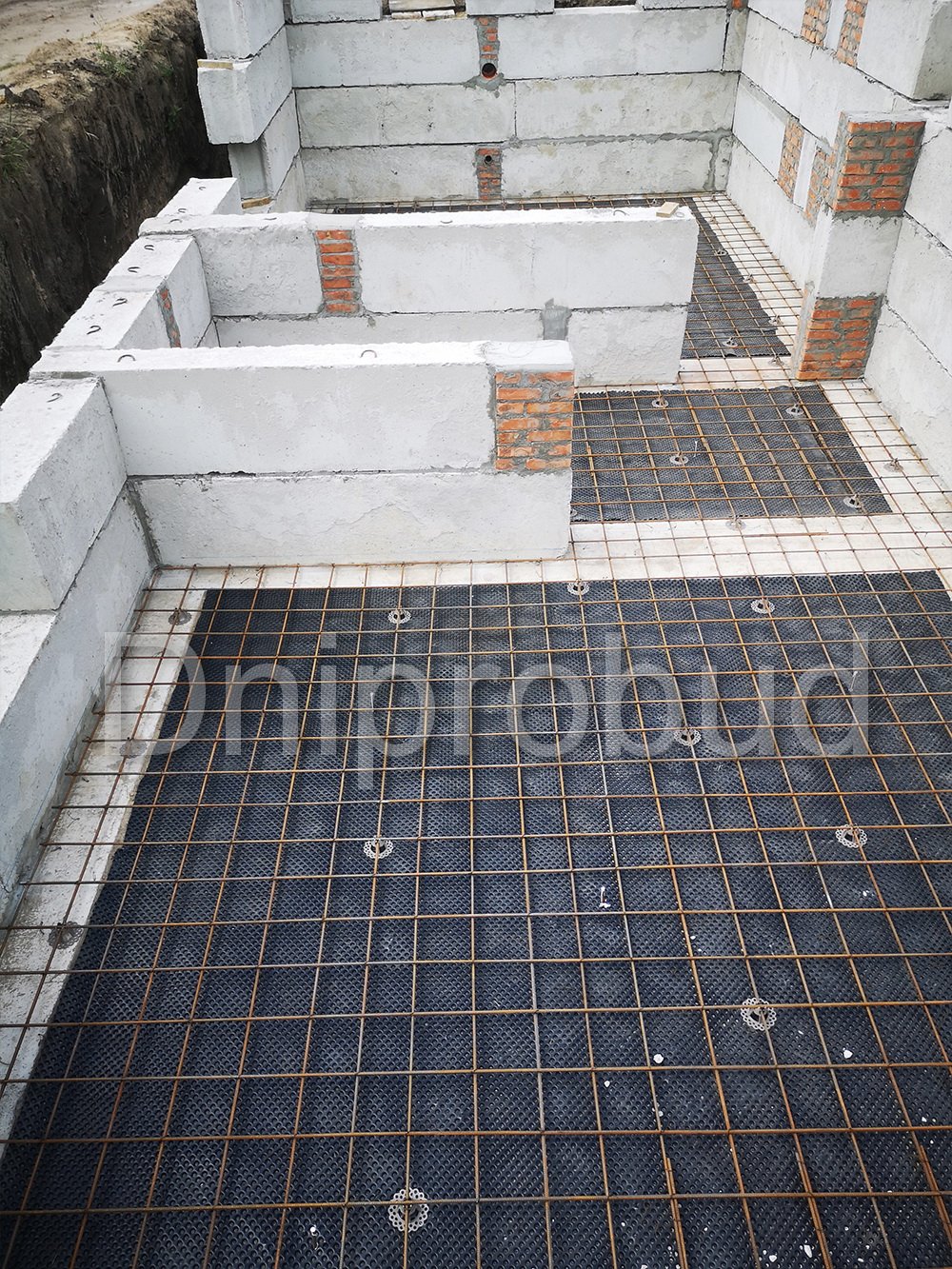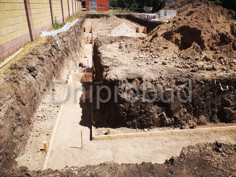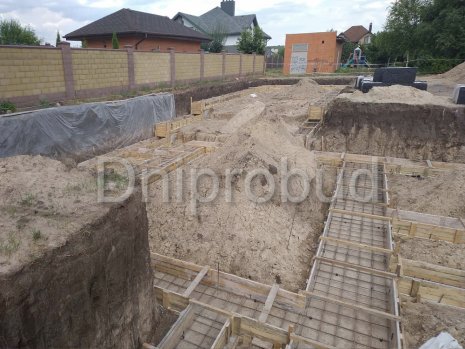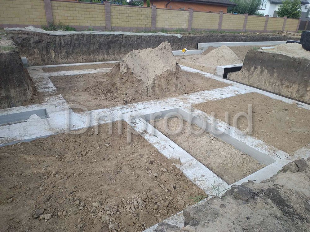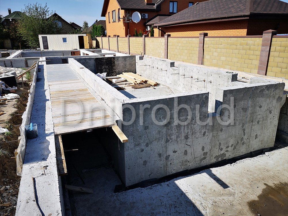 - Устройство цокольного этажа. Участок строительства имеет перепад по высоте всего 0,3м, в пятне застройки дома, поэтому устройство цокольного этажа предполагает большое количество земляных работ. В цокольном этаже дома располагается просторная мастерская, а также технические помещения: топочная, постирочная, помещение для хранения инвентаря. Вход в цокольный этаж осуществляется двумя способами: 1-й - по внутренней лестнице, 2-й - отдельный вход с улицы предусмотренный с левой стороны дома.