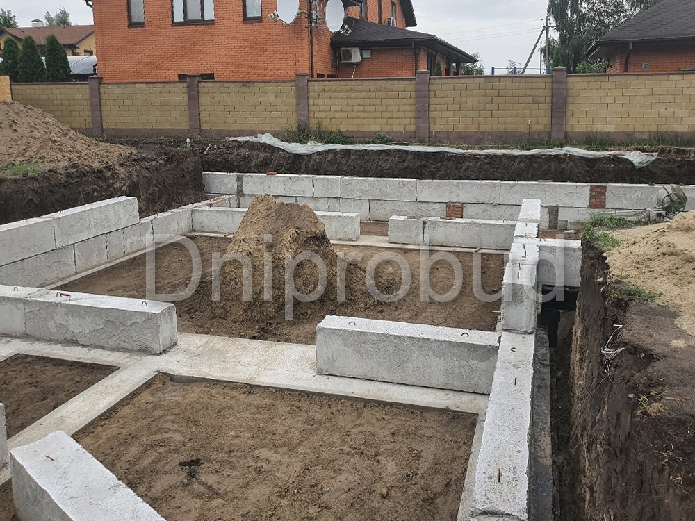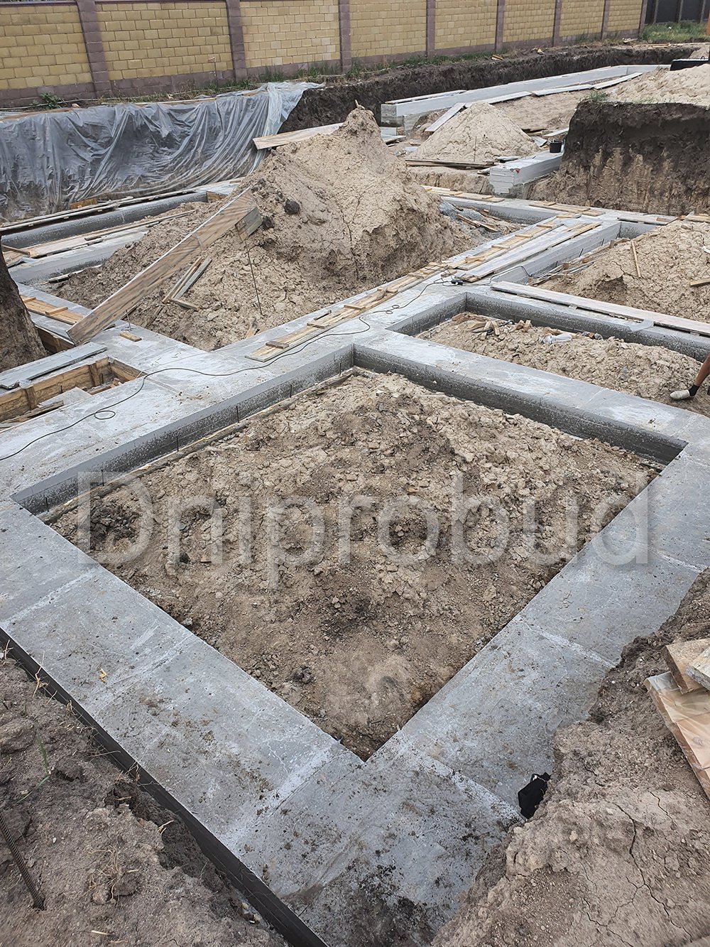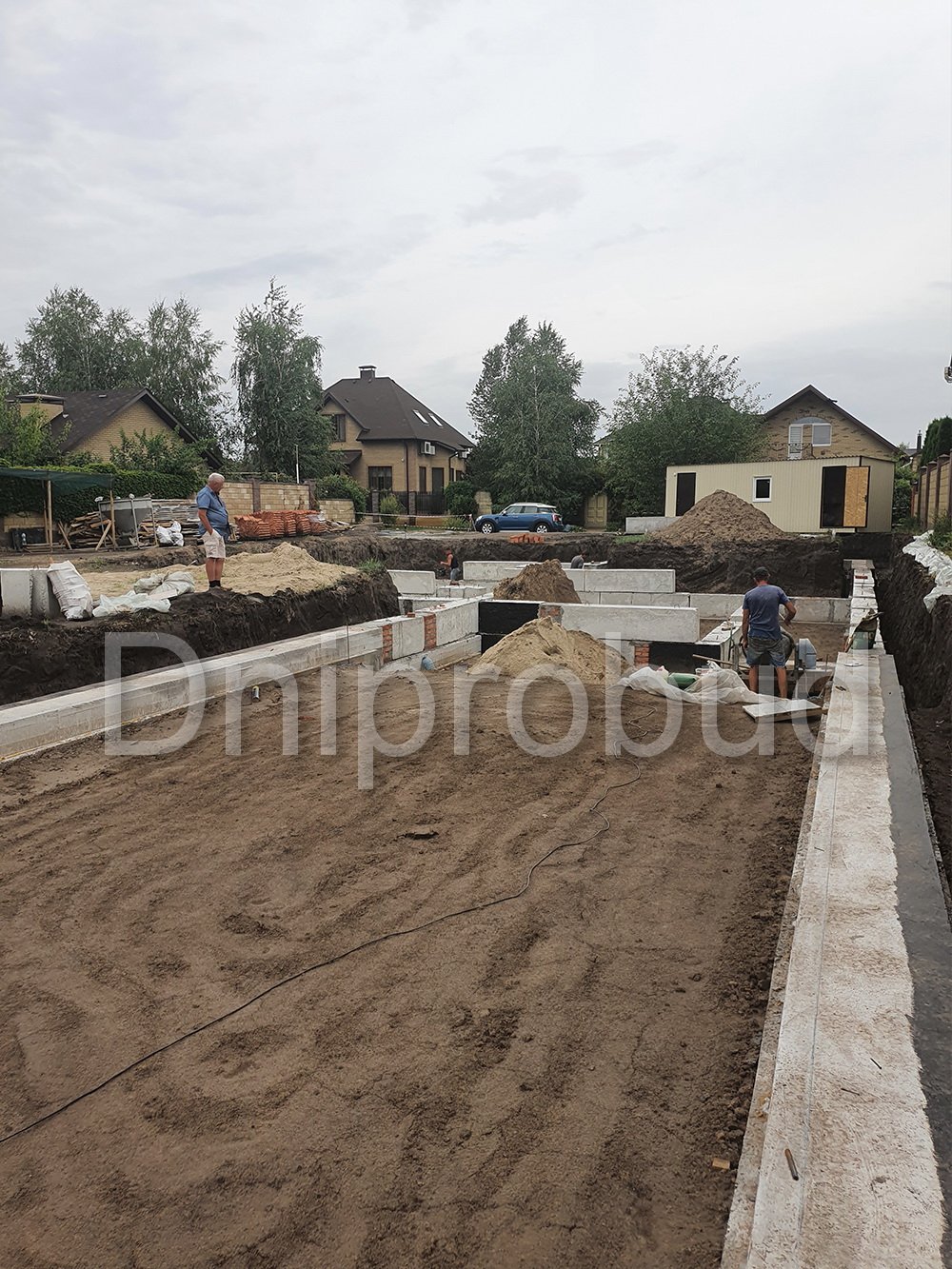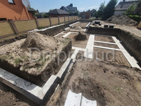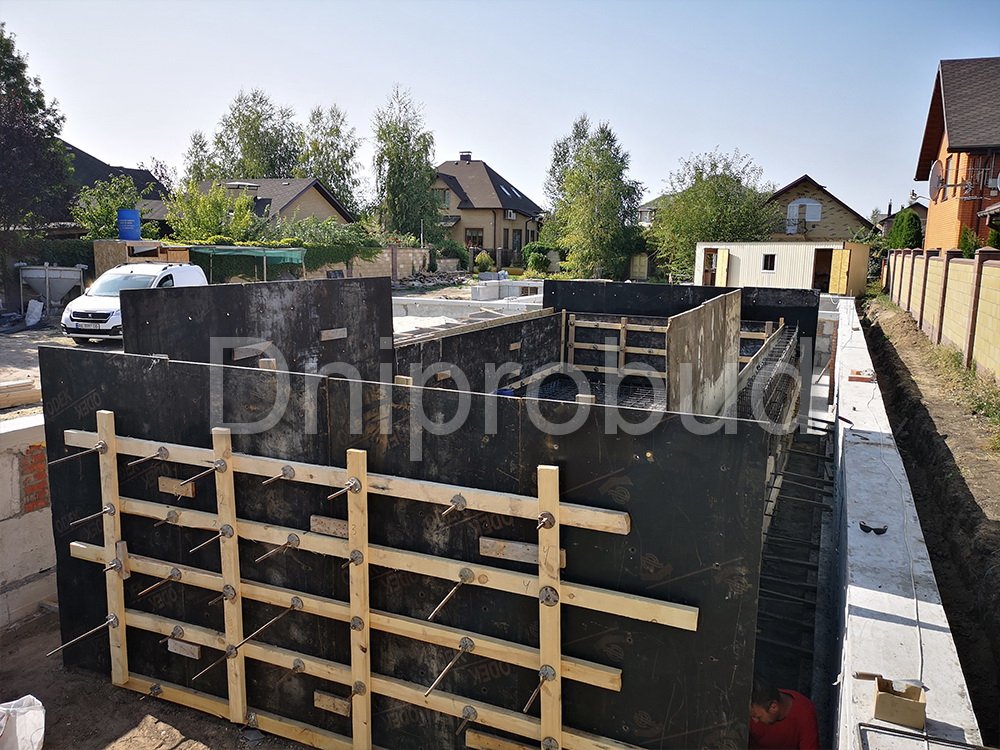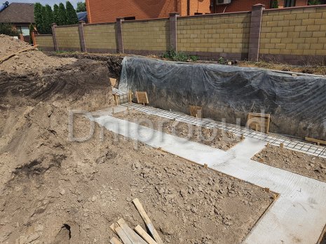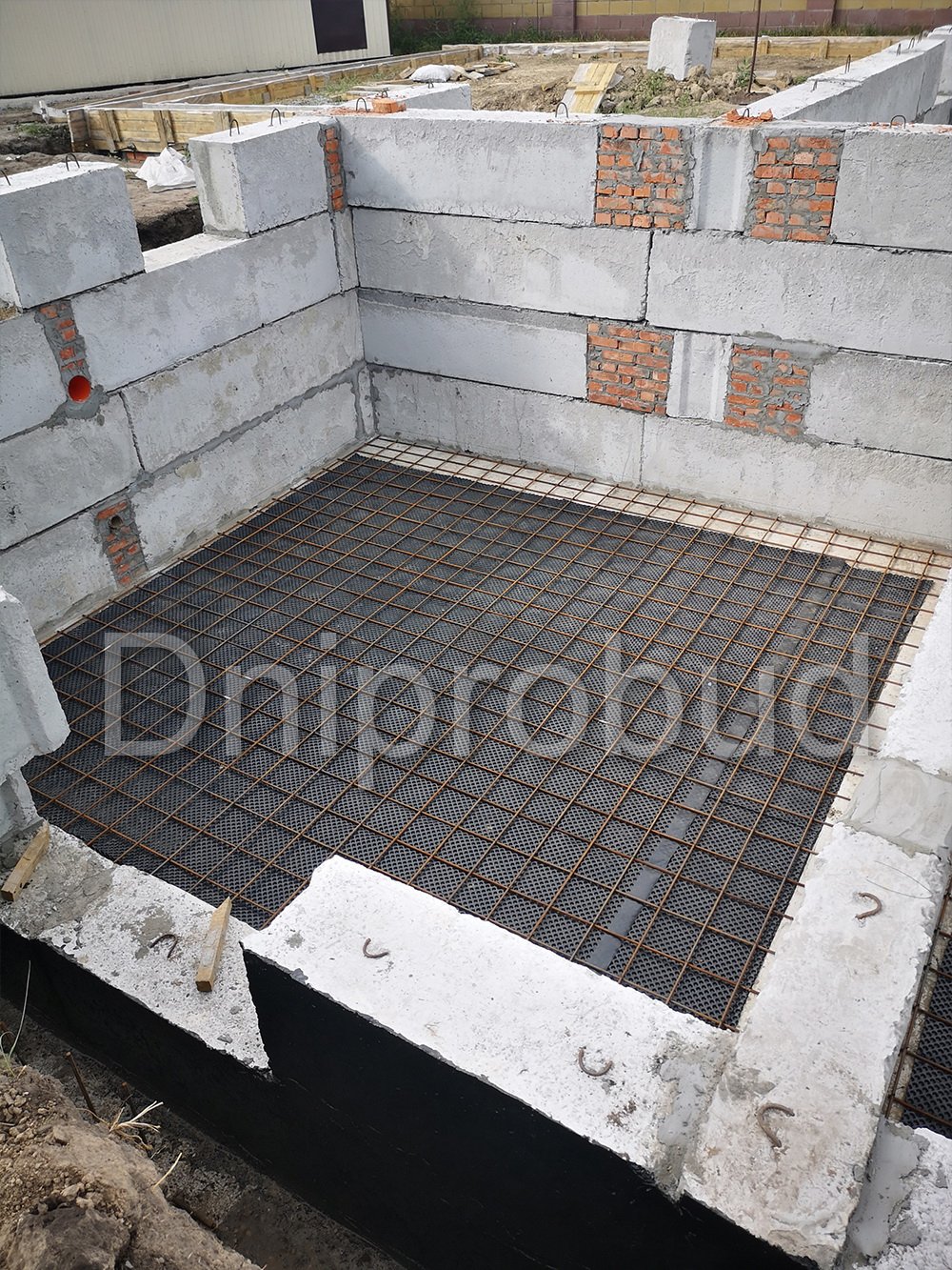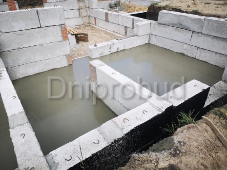 - Устройство цокольного этажа. Участок строительства имеет перепад по высоте всего 0,3м, в пятне застройки дома, поэтому устройство цокольного этажа предполагает большое количество земляных работ. В цокольном этаже дома располагается просторная мастерская, а также технические помещения: топочная, постирочная, помещение для хранения инвентаря. Вход в цокольный этаж осуществляется двумя способами: 1-й - по внутренней лестнице, 2-й - отдельный вход с улицы предусмотренный с левой стороны дома.