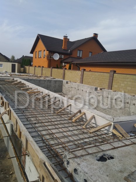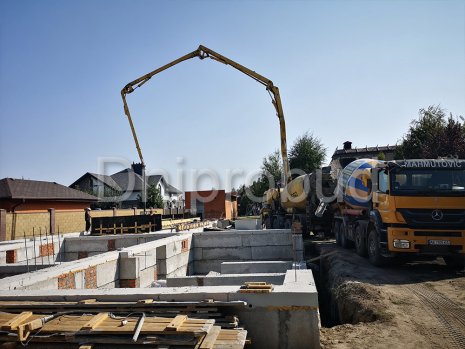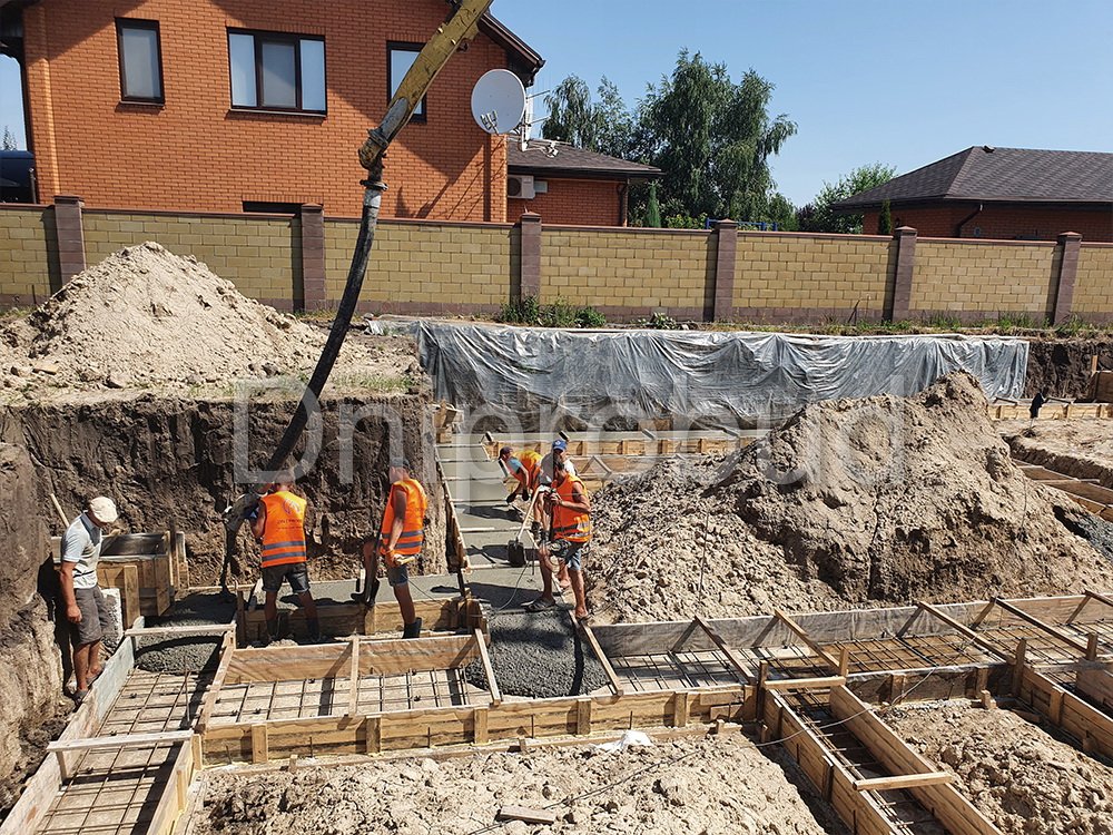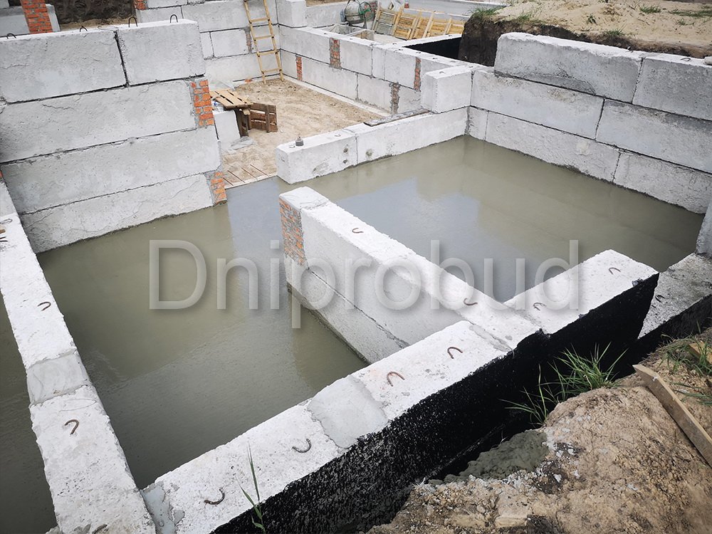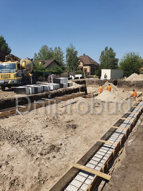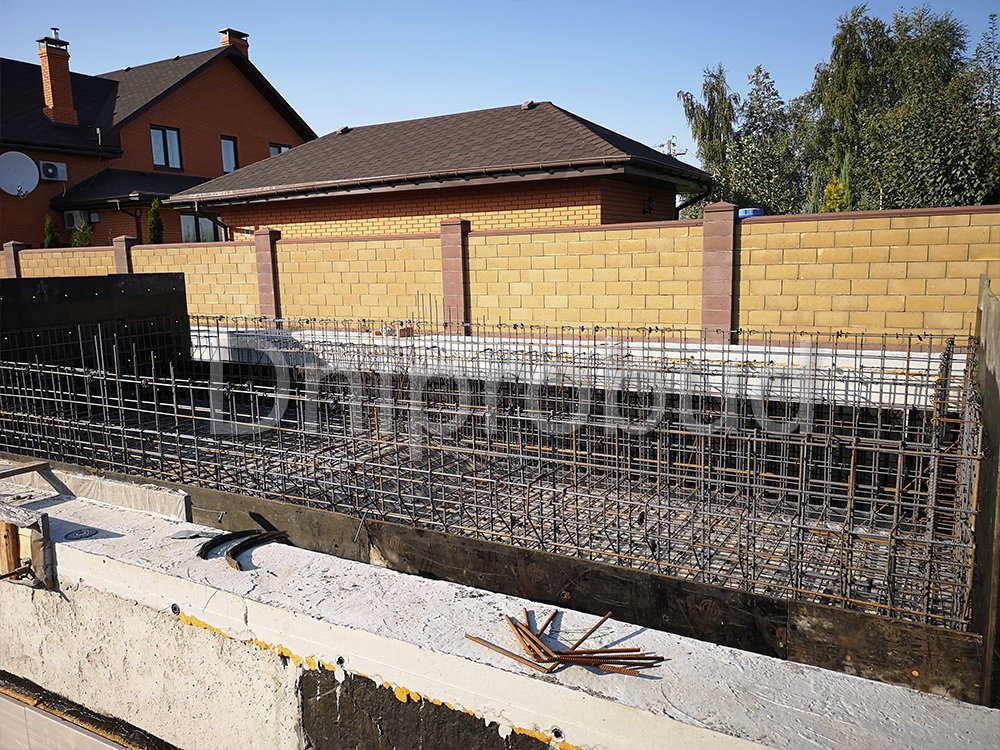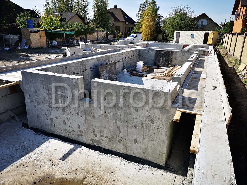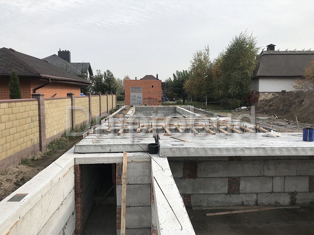 Фундамент объекта сборно-монолитный: монолитная железобетонная подушка+4 ряда блоков в цокольной части дома, 3 ряда блоков в зоне гостиной, 2 ряда блоков в зоне бассейна и 1 ряд блоков в зоне гаража. Материал стен - керамический блок. Кровля - натуральная черепица. Наружная отделка стен выполнена в трех материалах - декоративная штукатурка+клинкерный кирпич+алюминиевые композитные панели, отделка цоколя - гранитные плиты.