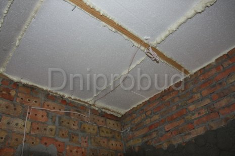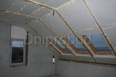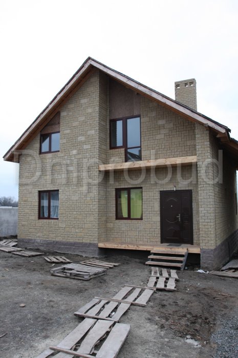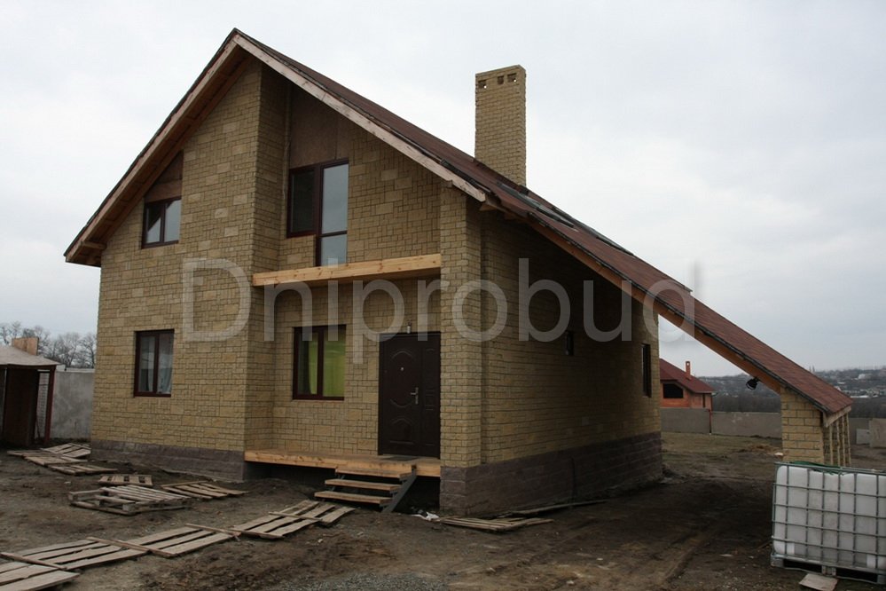 Строительство коттеджа со вторым светом в Днепропетровске(с. Любимовка). В гостиной нет ровного потолка, мансардные окна в кровле дают свет на 1-й этаж. Площадь 160 м. кв. + навес для авто, как продолжение кровли. Облицовочный кирпич положен на фронтальной стене — хаотично, без какой — либо закономерности, а на остальных стенах в виде мозаики, но с разными рисунками. На тыльной стене дома обустроена «подвесная» терраса. Вид на р. Днепр.