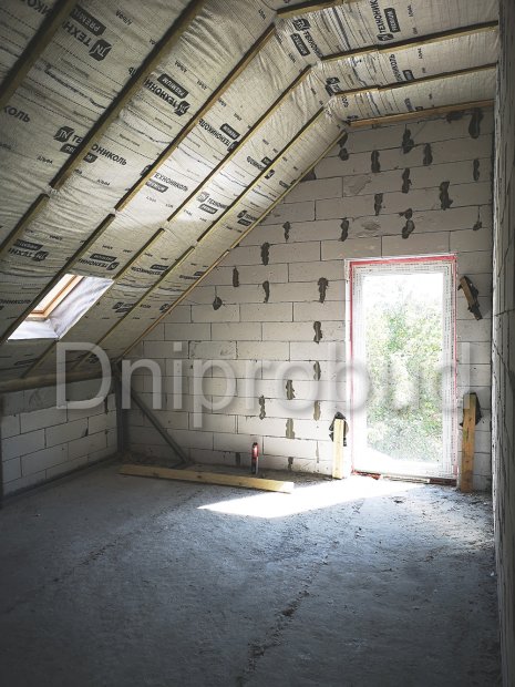 - Крыша дома скатная. Кровля выполнена из битумной черепицы. Конструкция крыши состоит из: пароизоляции, утеплителя из минеральной ваты толщиной 200 мм, стропильной системы, супердиффузионной мембраны, обрешетки, OSB-3, битумной черепицы.