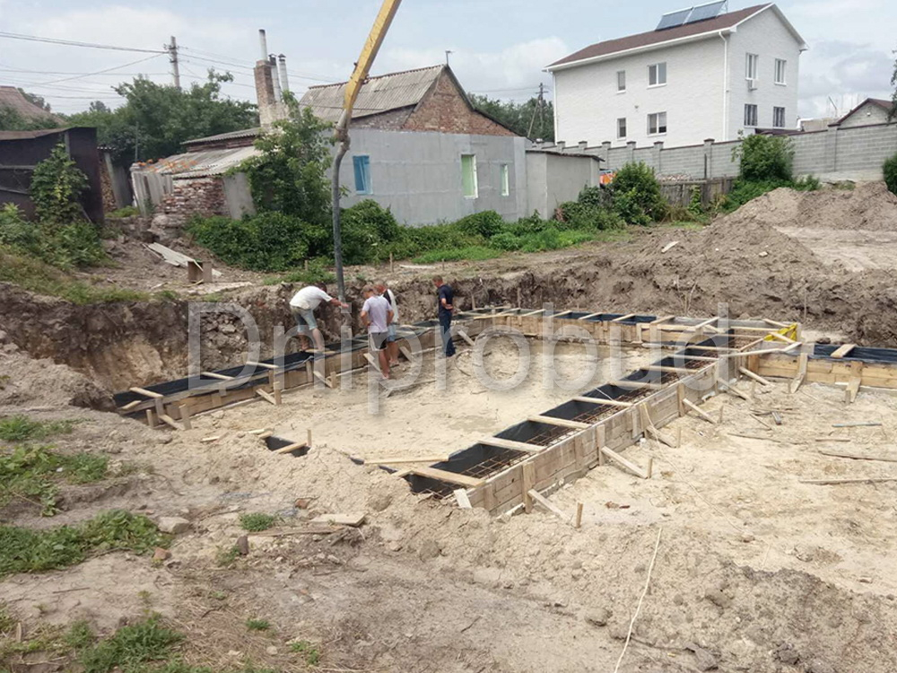 Особенностью данного проекта является расположение соседнего участка на значительно более высоком уровне по сравнению с местом строительства. Это вызвало необходимость возведения массивной подпорной стены, которая одновременно служит цоколем будущего ограждения участка.