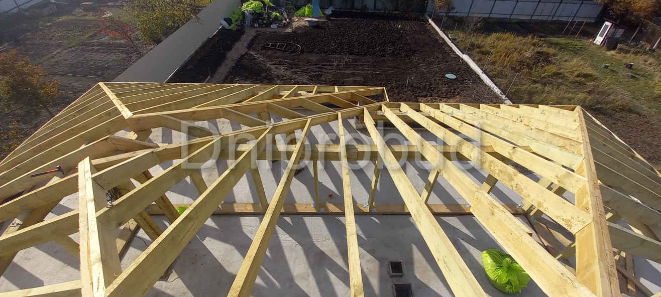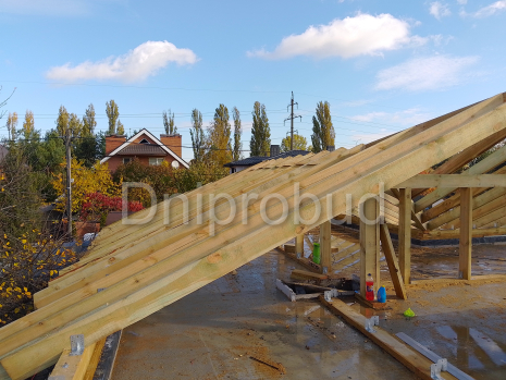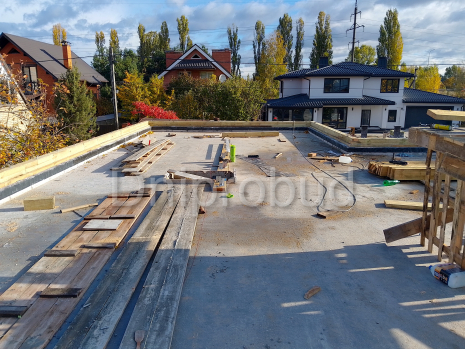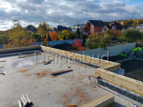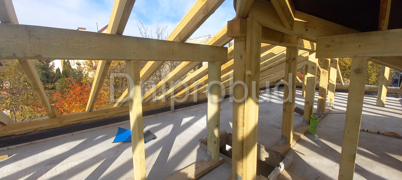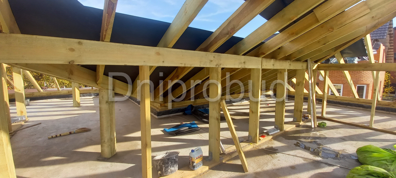 Кровля над террасой выполнена вместе с кровлей дома с опорой на железобетонную колонну.