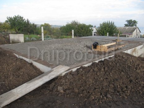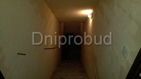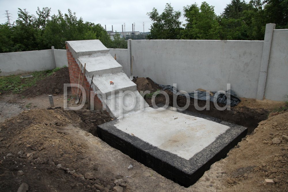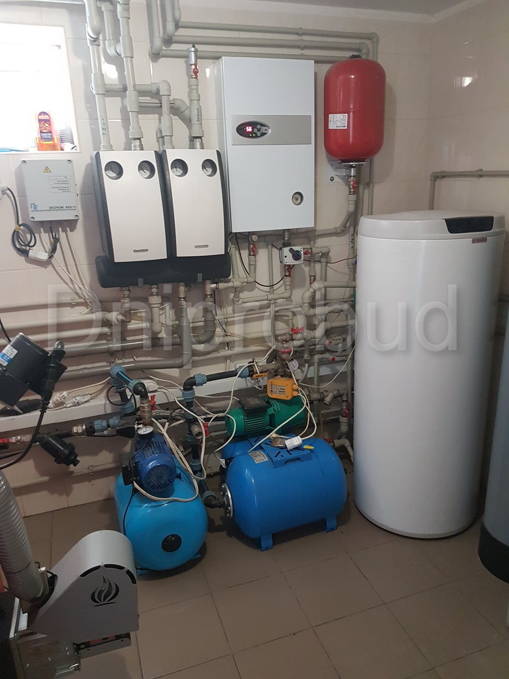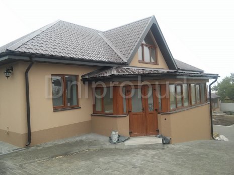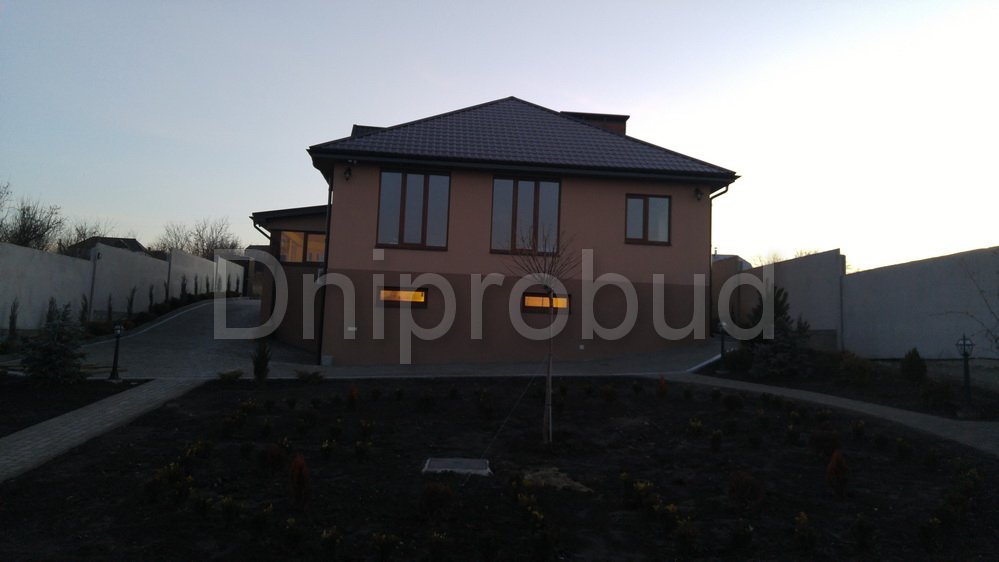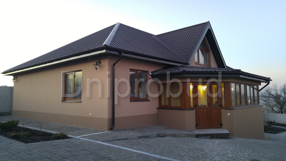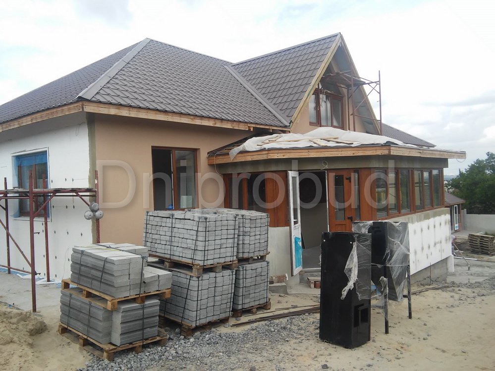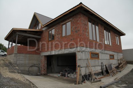 Дом в «районе Каменка», г. Днепр на склоне с большим перепадом высоты более 8 м по участку. Такой значительный перепад высот привел к необходимости и экономической целесообразности обустройства полуподвального помещения под половиной здания. В этом помещении разместились: гараж на два авто и котельная, которая содержит: электрокотел, систему очистки воды, твердотопливный котел шнекового типа.