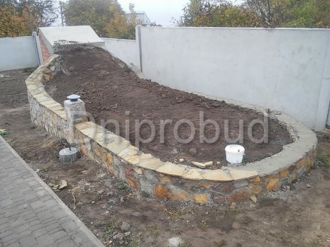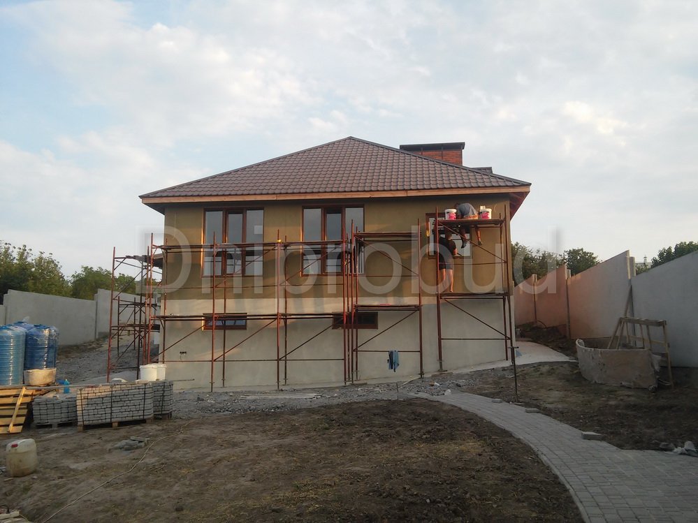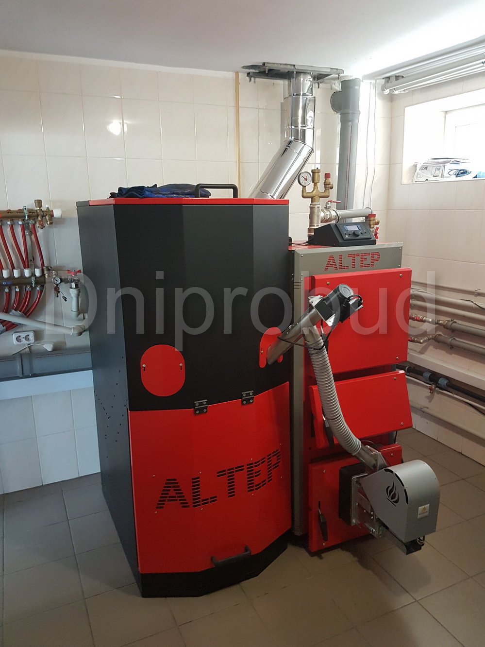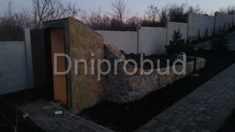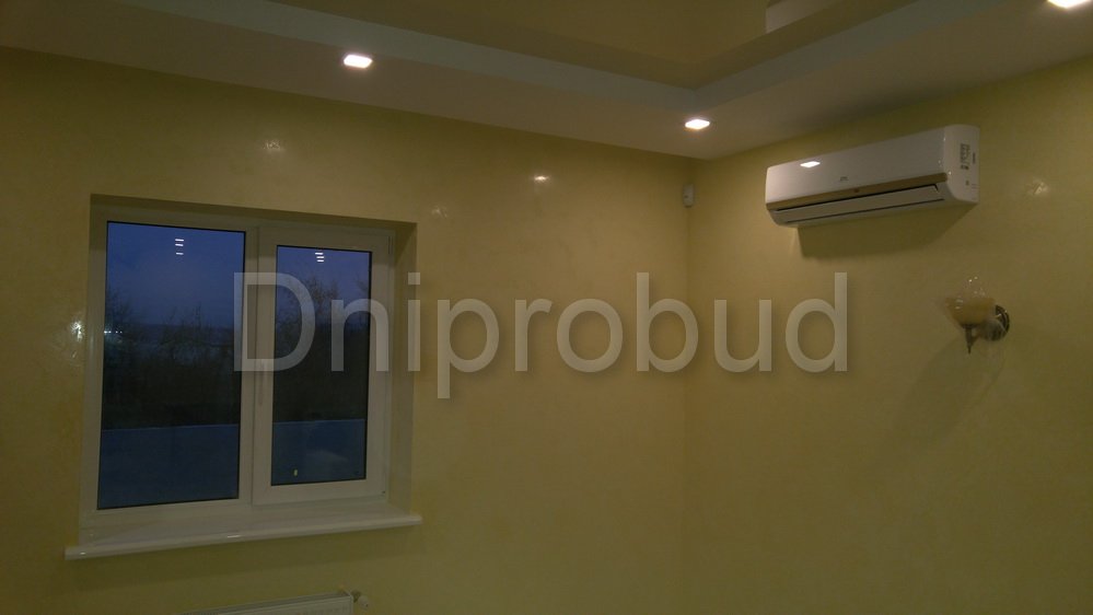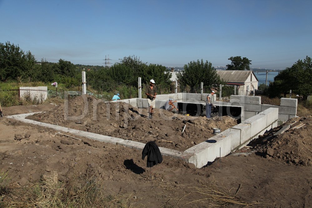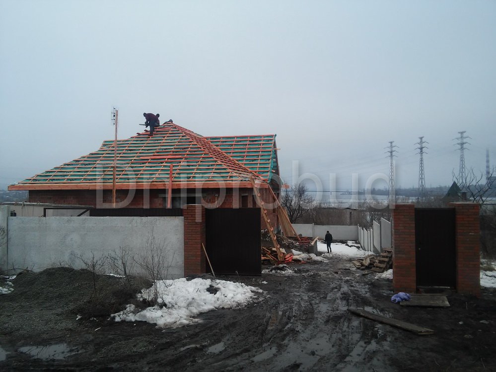 Дом в «районе Каменка», г. Днепр на склоне с большим перепадом высоты более 8 м по участку. Такой значительный перепад высот привел к необходимости и экономической целесообразности обустройства полуподвального помещения под половиной здания. В этом помещении разместились: гараж на два авто и котельная, которая содержит: электрокотел, систему очистки воды, твердотопливный котел шнекового типа.
