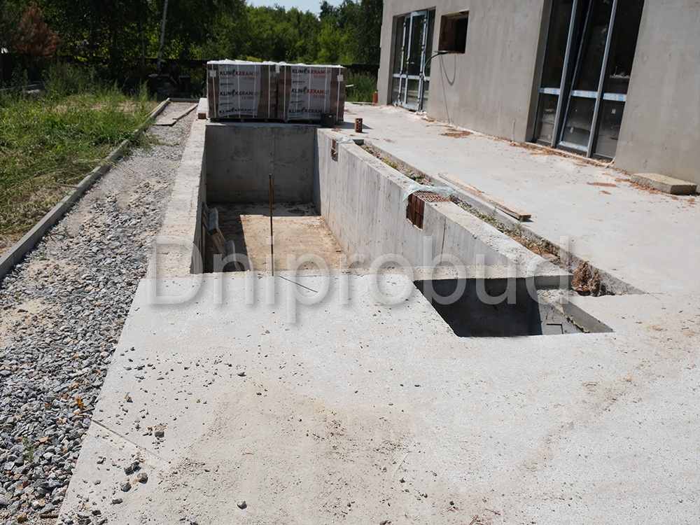 Для увеличения жилой площади вместо гаража оборудована жилая комната и второй санузел. Возле дома организована терраса, на которой расположена сауна с душевым отделением. К террасе примыкает бассейн размером 2 м * 12 м. Под террасой оборудовано техническое помещение для размещения систем очистки воды и полива участка.