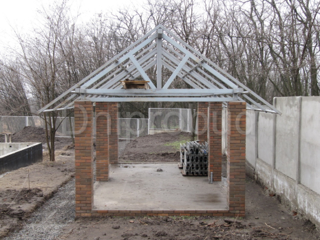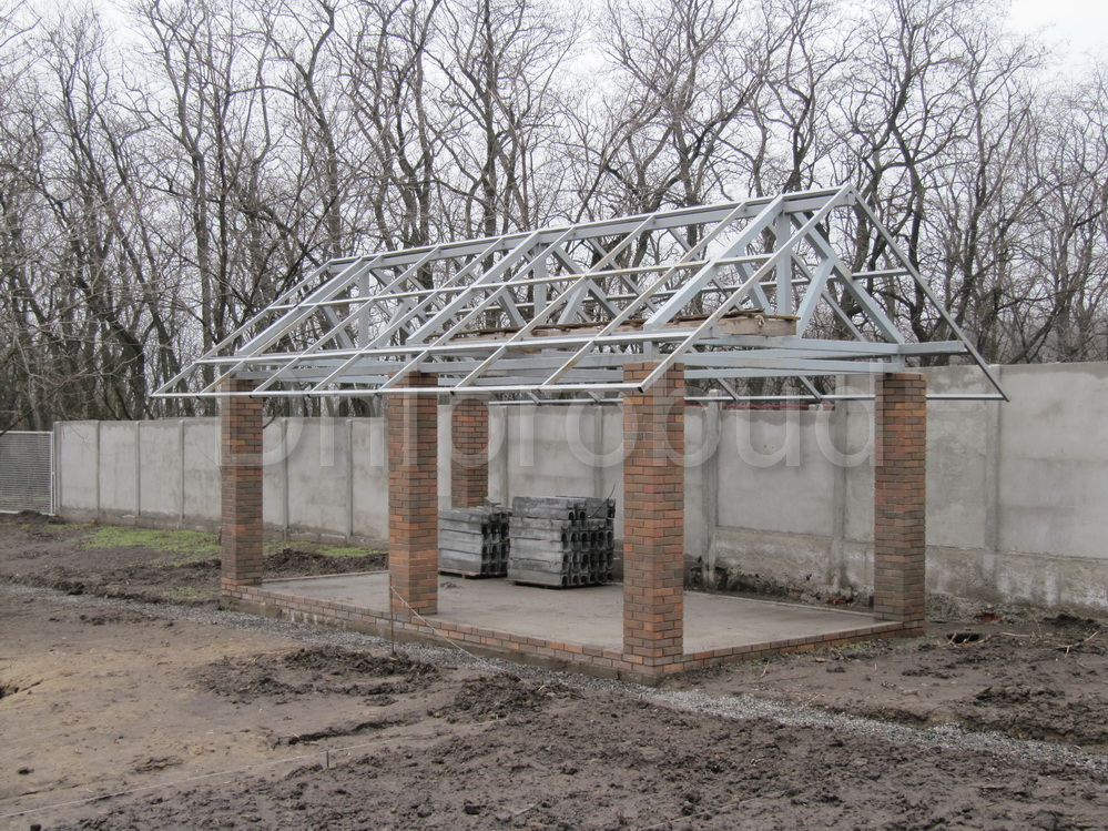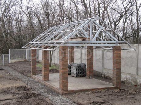 Каркас выполнен из квадратной трубы 100*100 мм. Столбы обложены клинкерным кирпичом. Фундамент (черновой пол) — ж/б плита. Читать больше