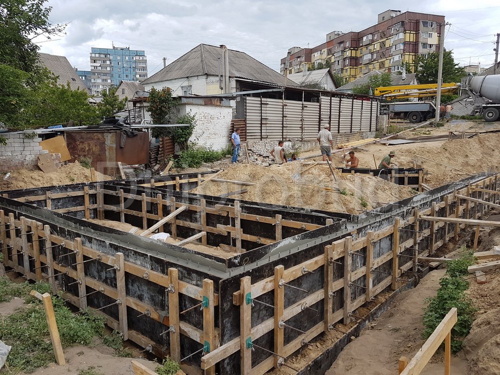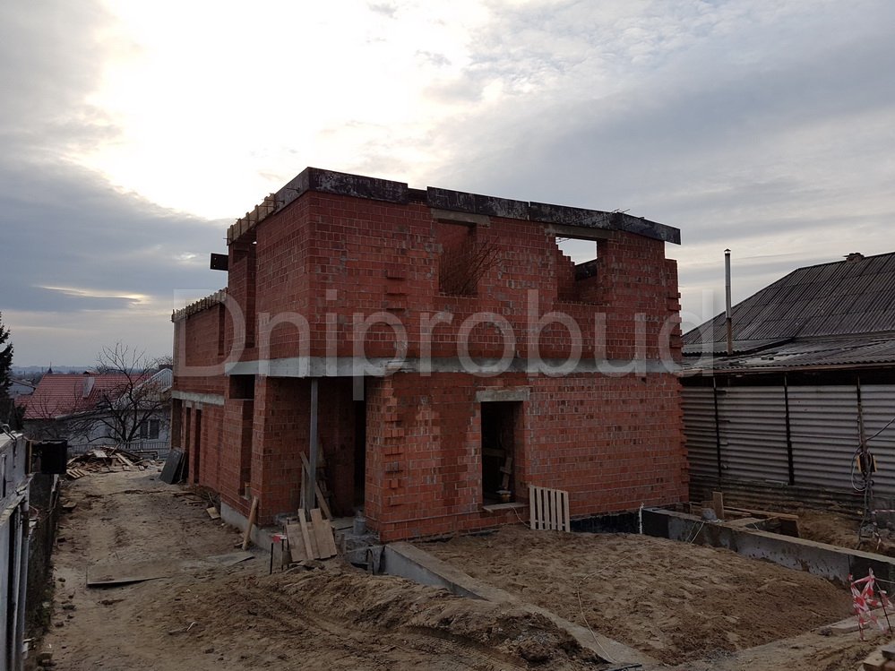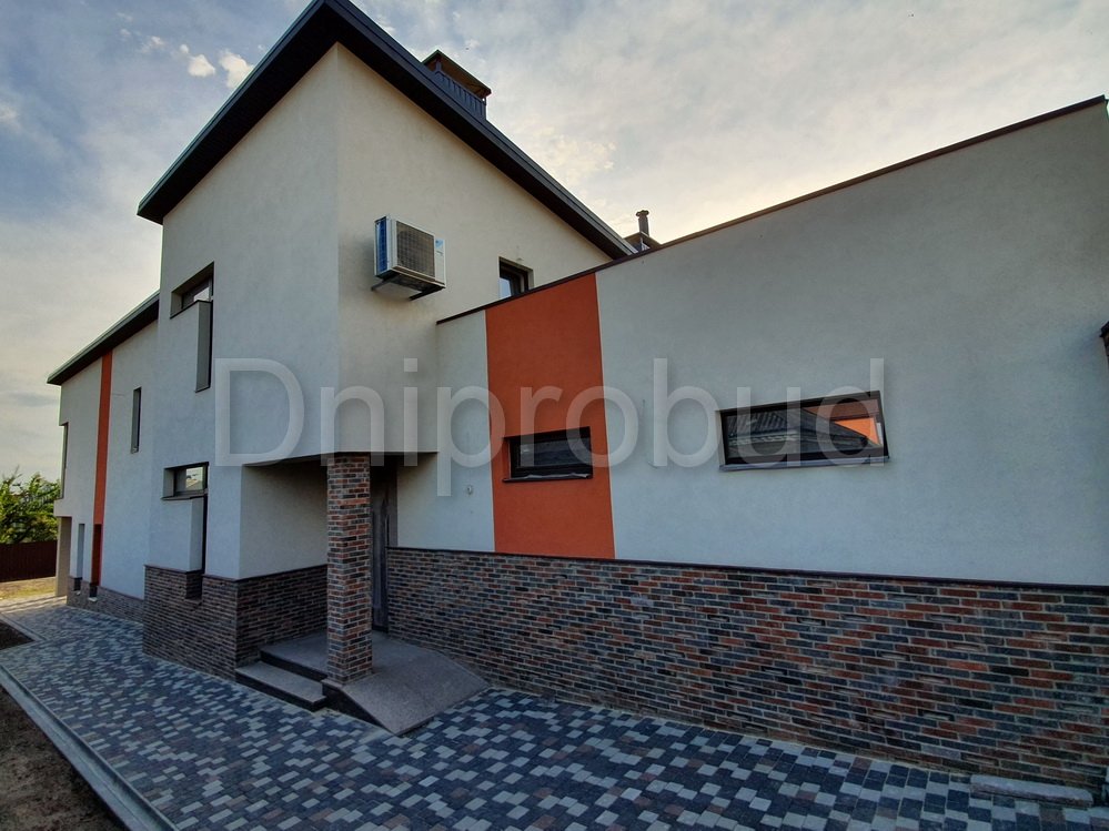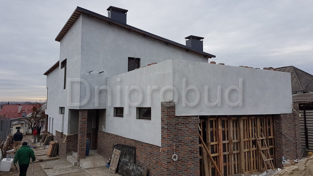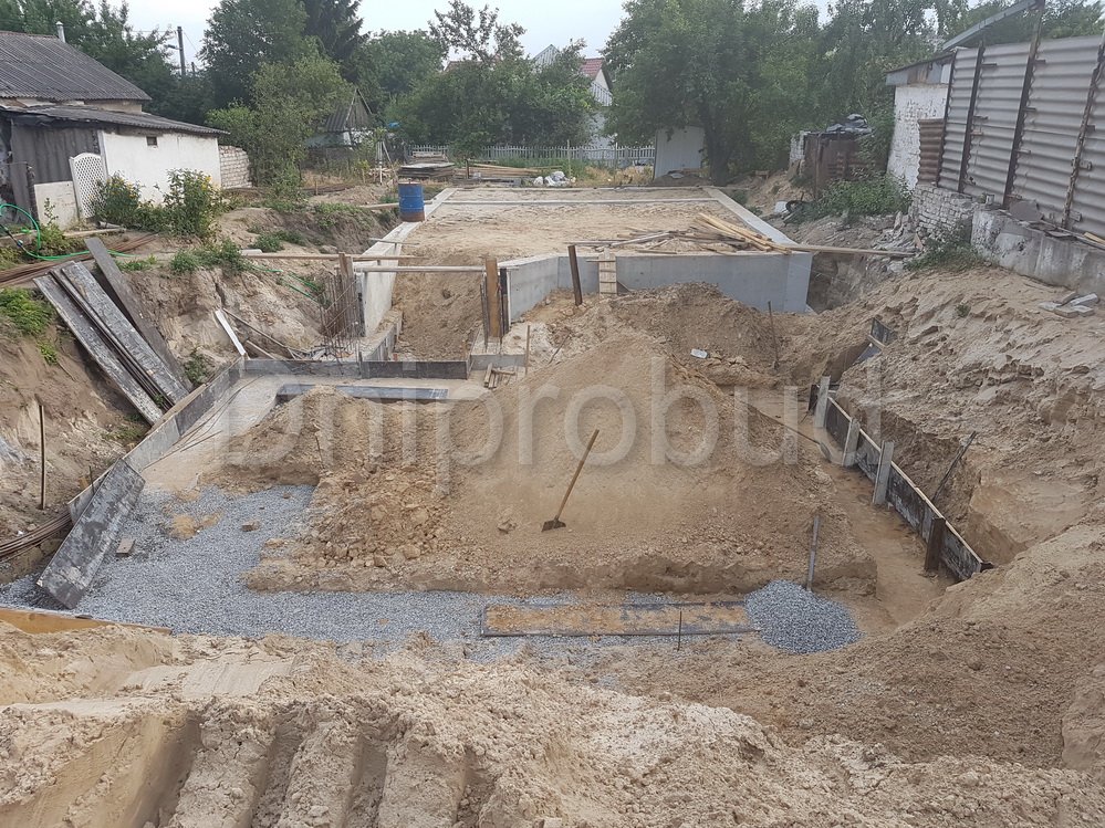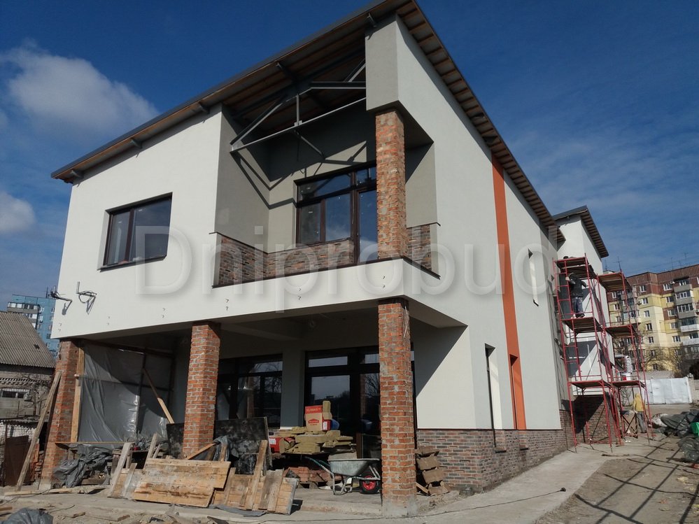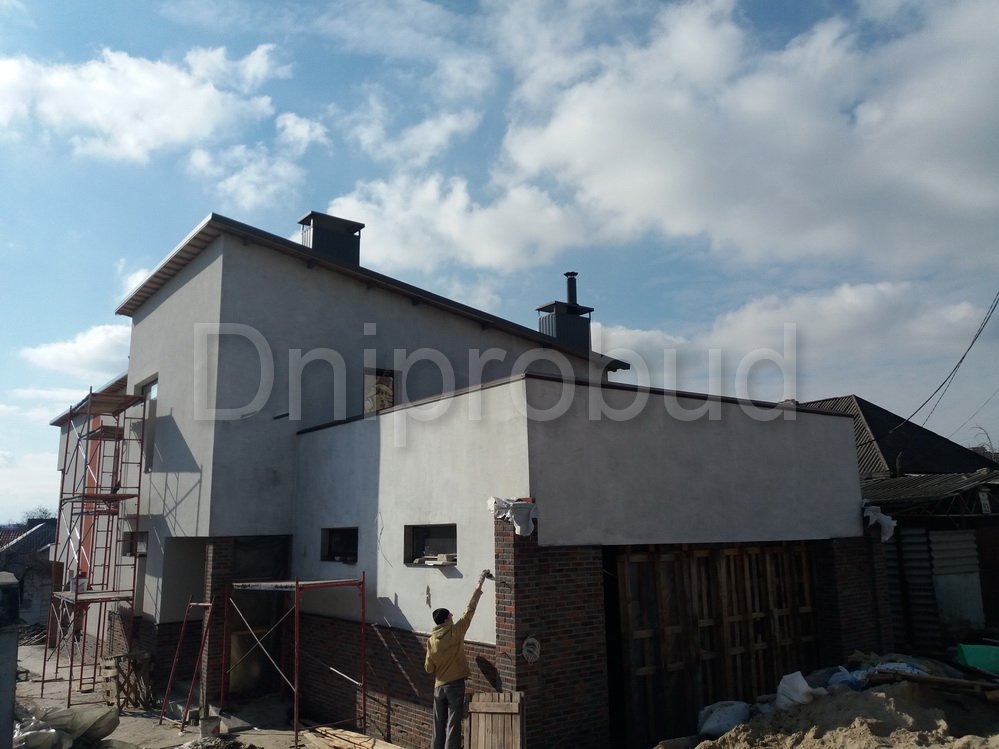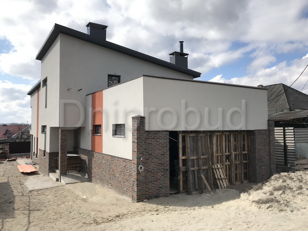 Современный котедж на левом берегу р. Днепр. Строительство осуществлялось на сложных грунтах с высоким уровнем грунтовых вод, что является характерной особенностью данного района г. Днепр. Были проведены работы по обустройству дренажной системы (дренажные трубы, канал из щебня, переливные колодцы). Также проведены дополнительные меры по гидроизоляции фундамента, особенно его цокольной части: гидроизоляция выполнялась наплавлением рубероида, использование для цокольной части фундамента гидротехнического бетона водонепроницаемости W6.