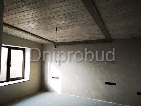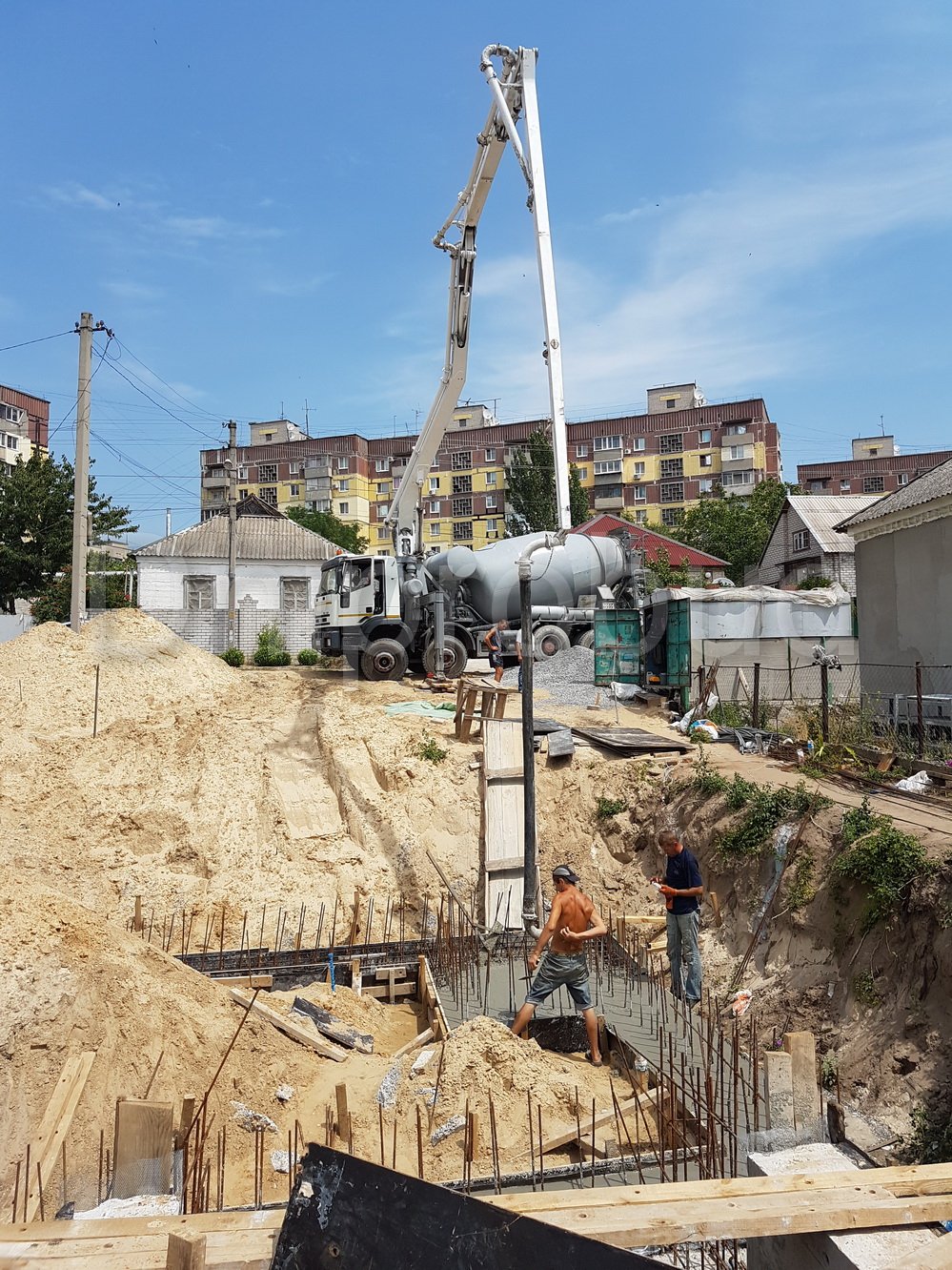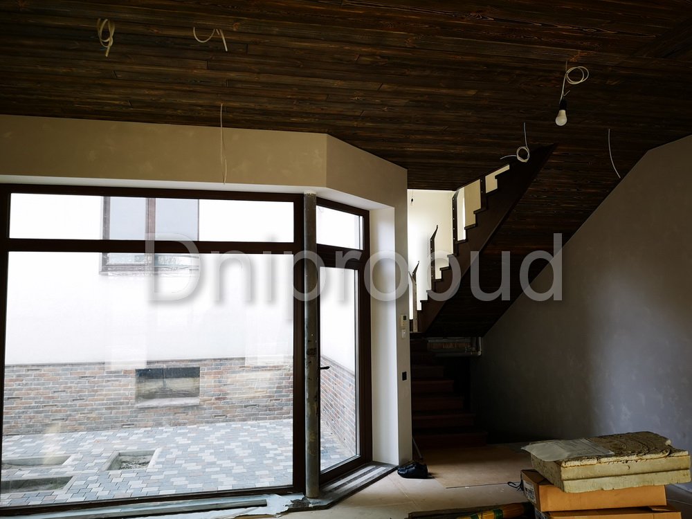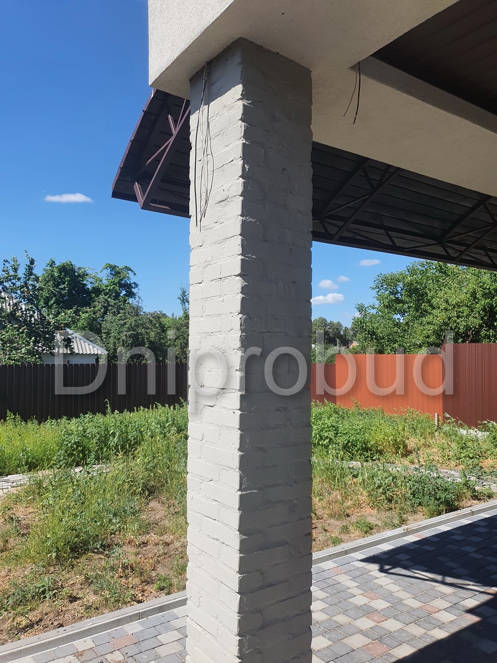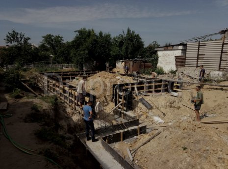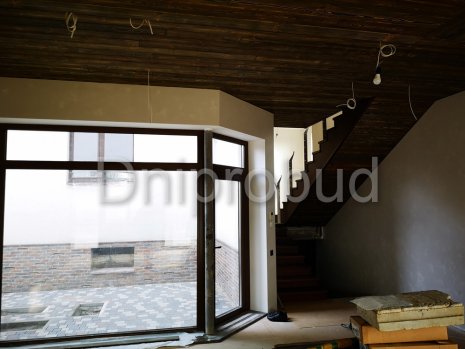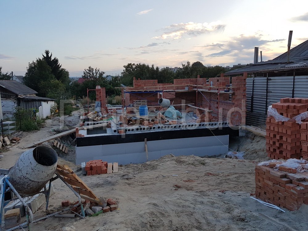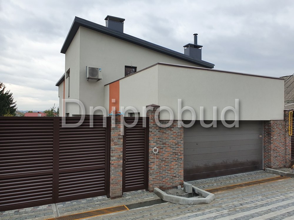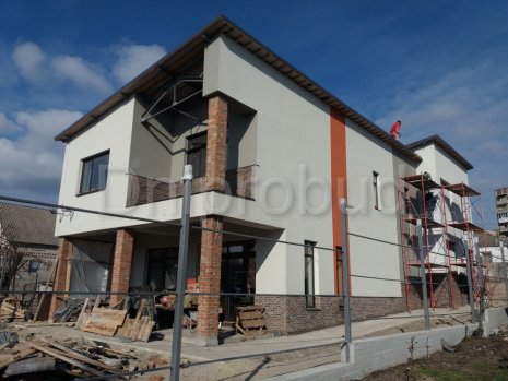Современный котедж на левом берегу р. Днепр. Строительство осуществлялось на сложных грунтах с высоким уровнем грунтовых вод, что является характерной особенностью данного района г. Днепр. Были проведены работы по обустройству дренажной системы (дренажные трубы, канал из щебня, переливные колодцы). Также проведены дополнительные меры по гидроизоляции фундамента, особенно его цокольной части: гидроизоляция выполнялась наплавлением рубероида, использование для цокольной части фундамента гидротехнического бетона водонепроницаемости W6.