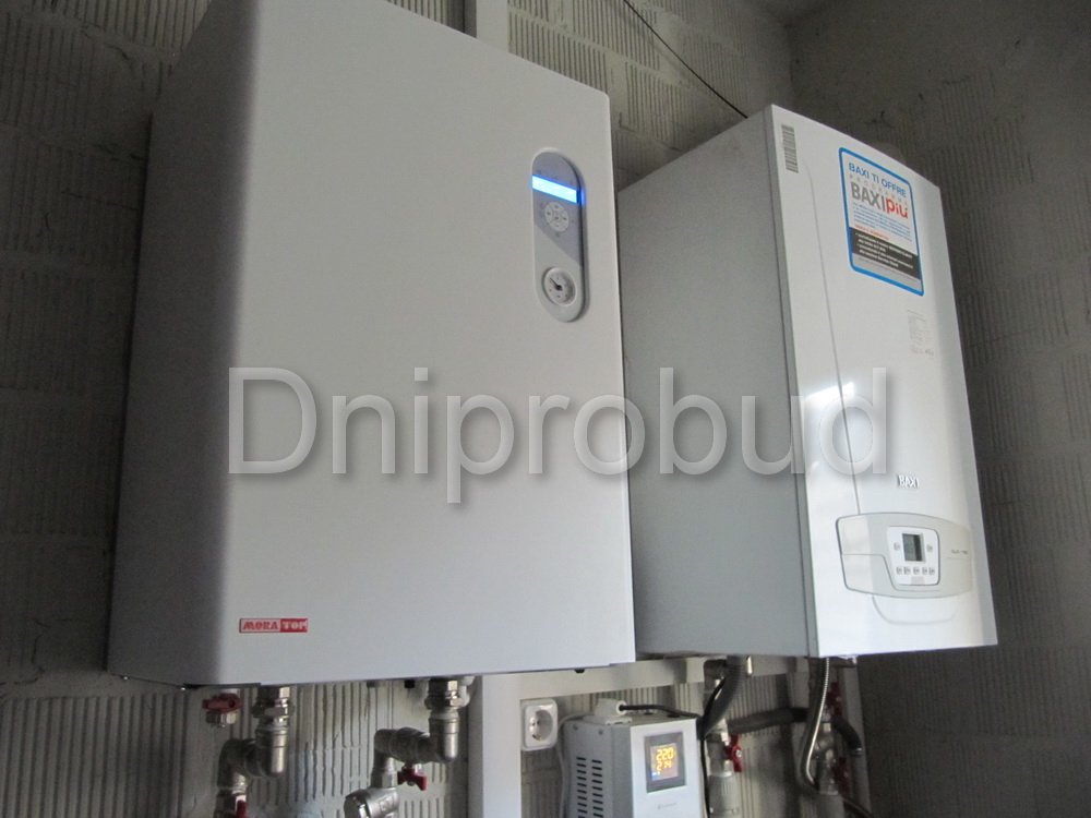 - Обустройство плоской крыши над гаражной частью. Комбинированная система отопления: газ + электрический котел.