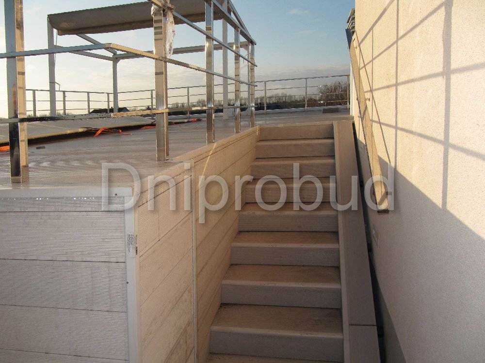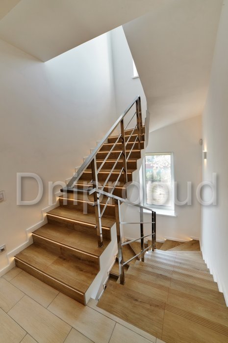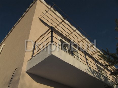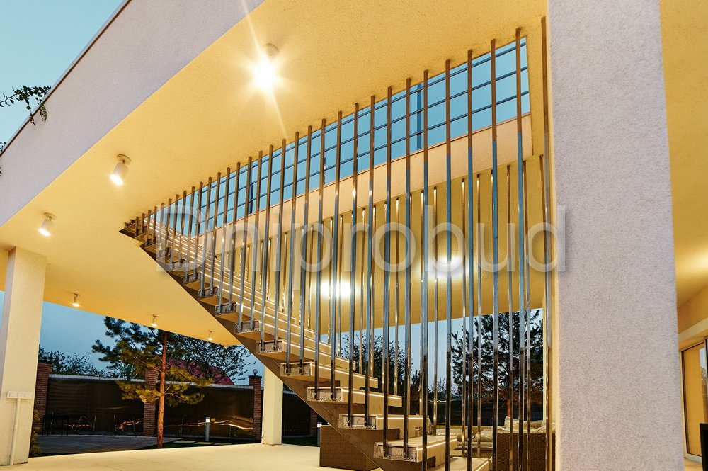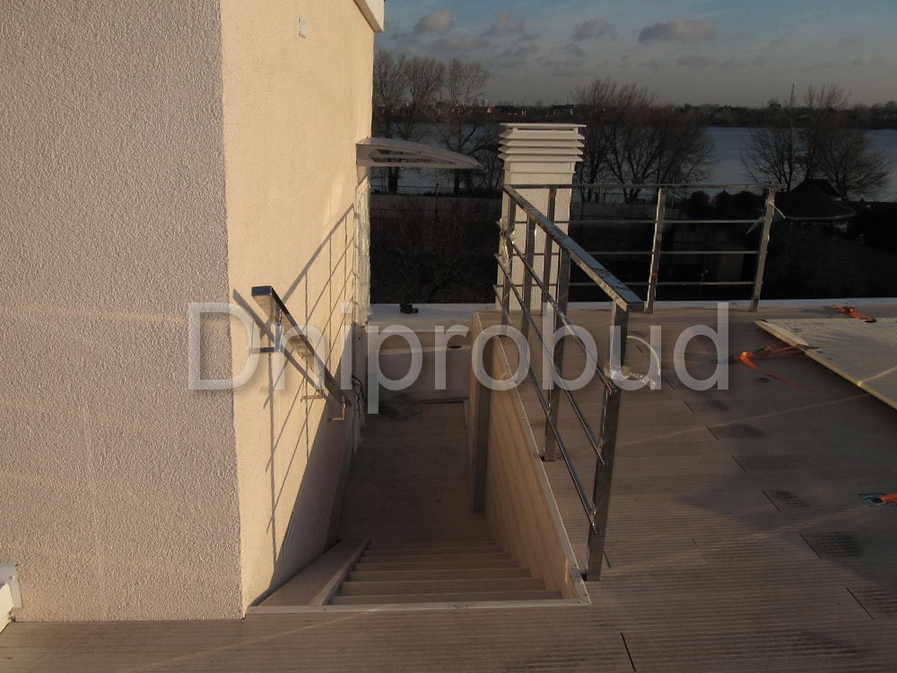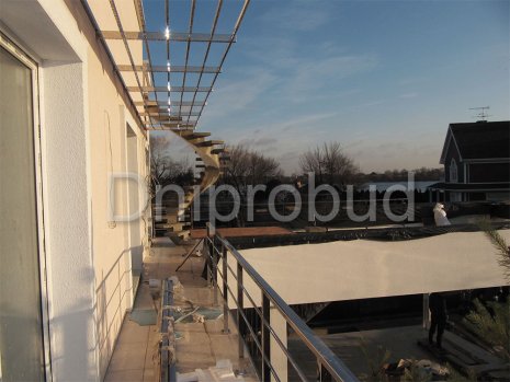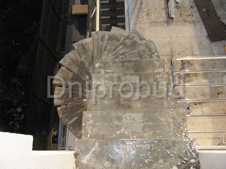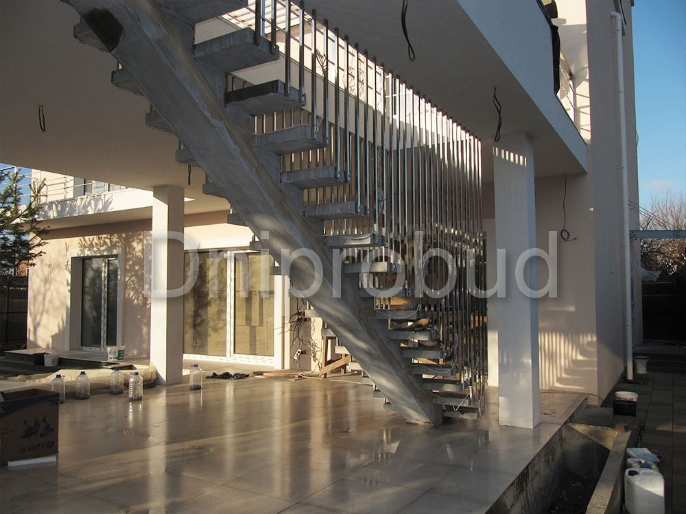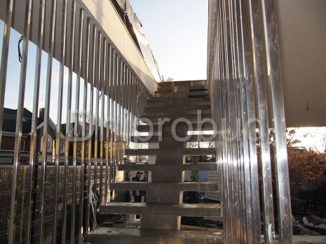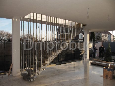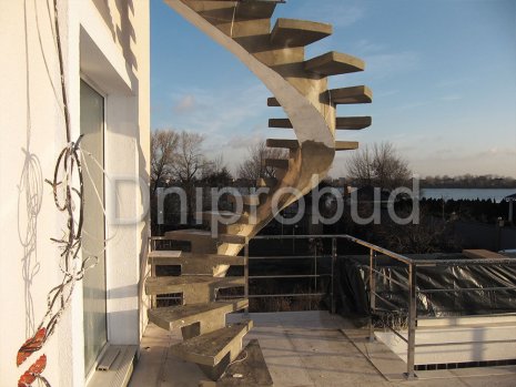 - Применение лестниц разных типов. Террасу первого и второго этажей связывает одномаршевая лестница ограждение которой выполнено из металлических профилей прямоугольного сечения, соединяющих ступени с монолитным перекрытием. Для связи уровня террасы второго этажа с уровнем третьего была предусмотрена винтовая монолитная лестница на одном косоуре. Внутри дома спроектирована монолитная железобетонная двухмаршевая лестница с забежными ступенями.