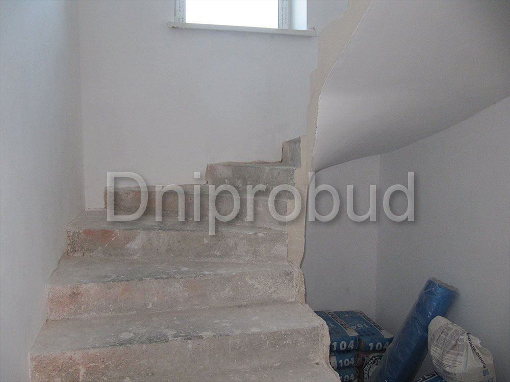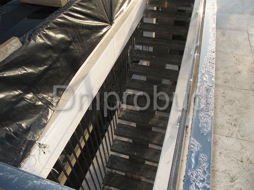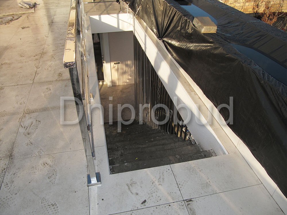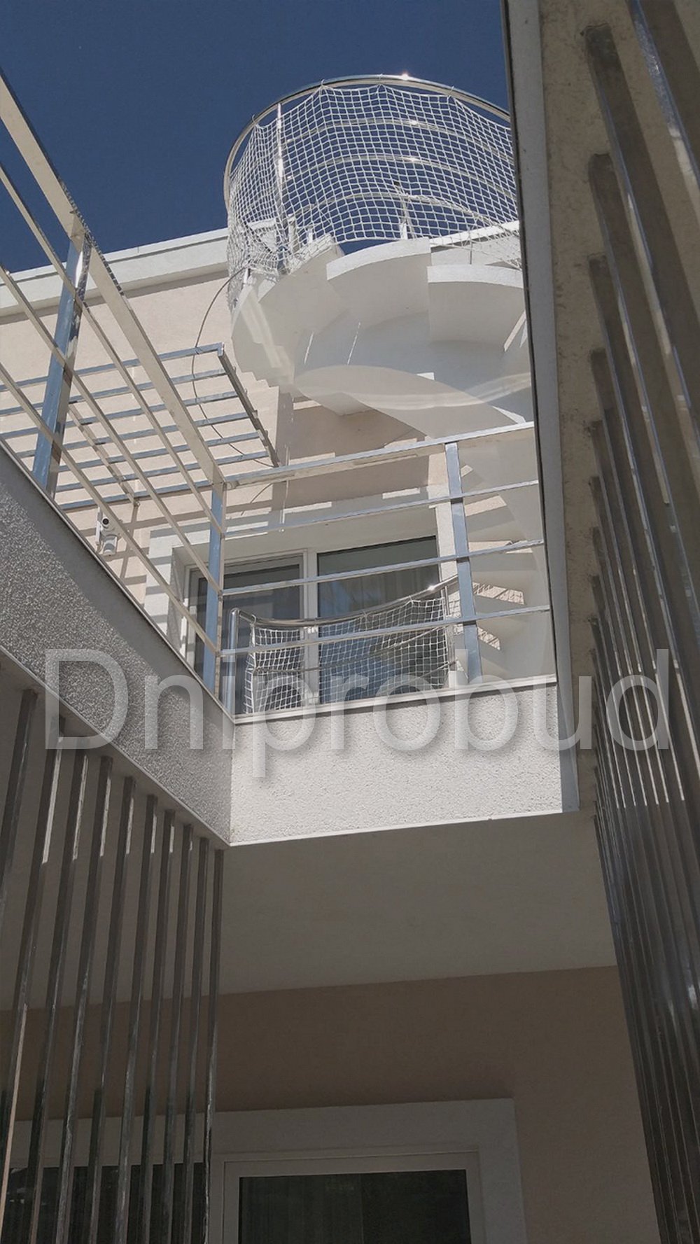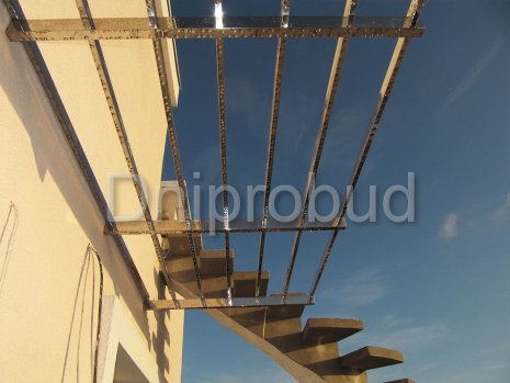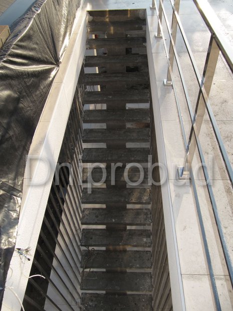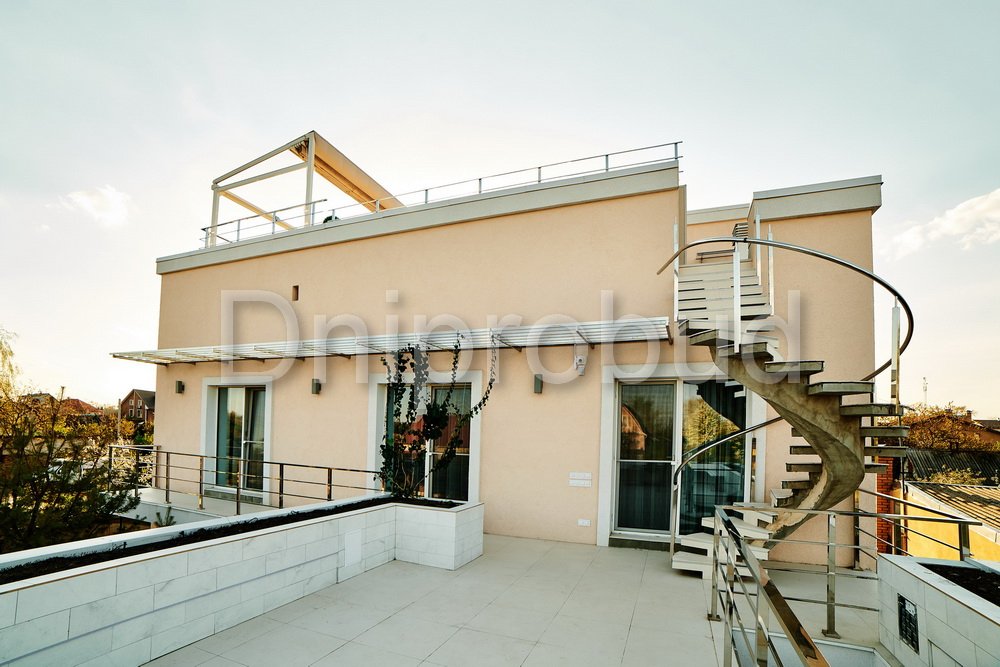 - Применение лестниц разных типов. Террасу первого и второго этажей связывает одномаршевая лестница ограждение которой выполнено из металлических профилей прямоугольного сечения, соединяющих ступени с монолитным перекрытием. Для связи уровня террасы второго этажа с уровнем третьего была предусмотрена винтовая монолитная лестница на одном косоуре. Внутри дома спроектирована монолитная железобетонная двухмаршевая лестница с забежными ступенями.