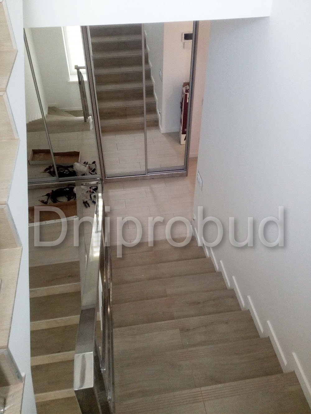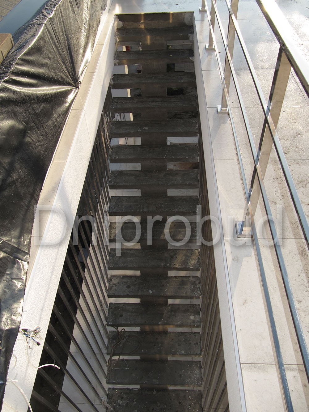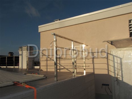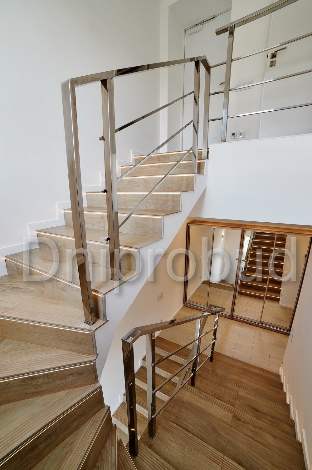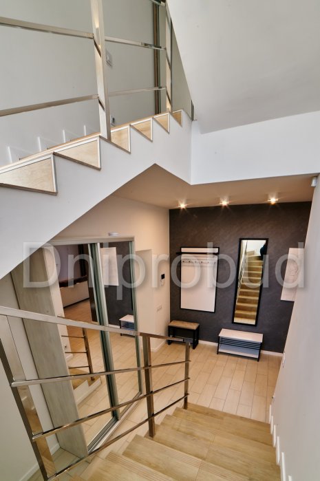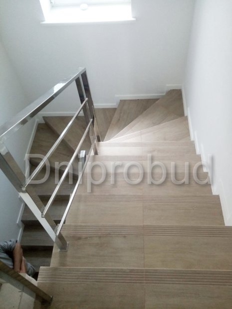 - Применение лестниц разных типов. Террасу первого и второго этажей связывает одномаршевая лестница ограждение которой выполнено из металлических профилей прямоугольного сечения, соединяющих ступени с монолитным перекрытием. Для связи уровня террасы второго этажа с уровнем третьего была предусмотрена винтовая монолитная лестница на одном косоуре. Внутри дома спроектирована монолитная железобетонная двухмаршевая лестница с забежными ступенями.