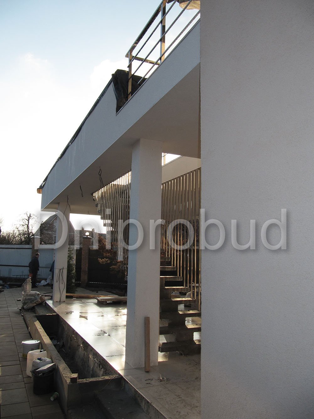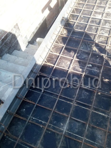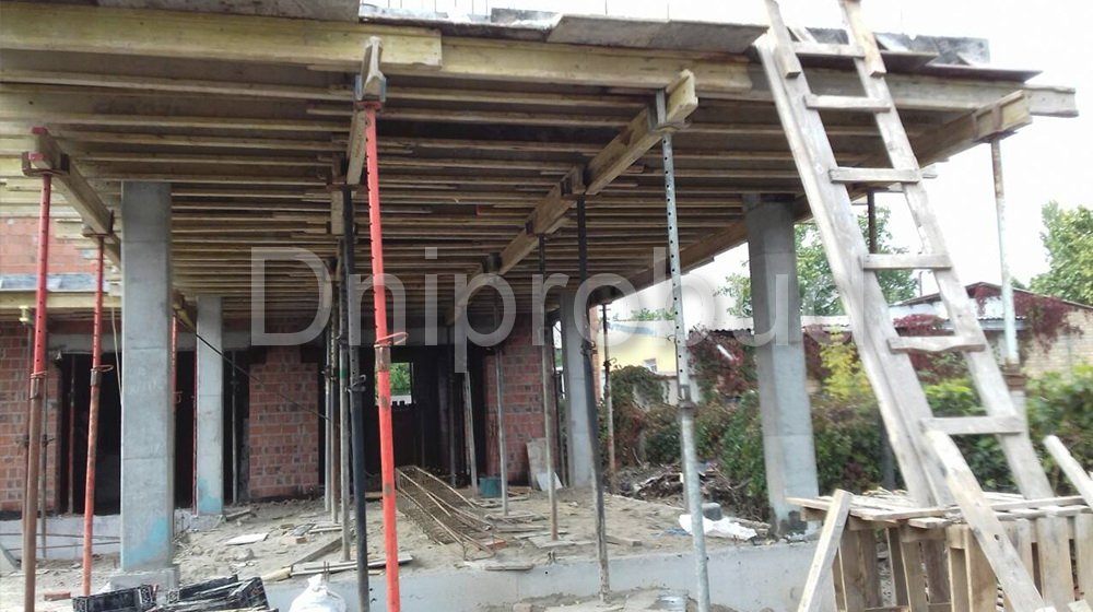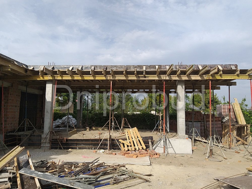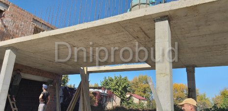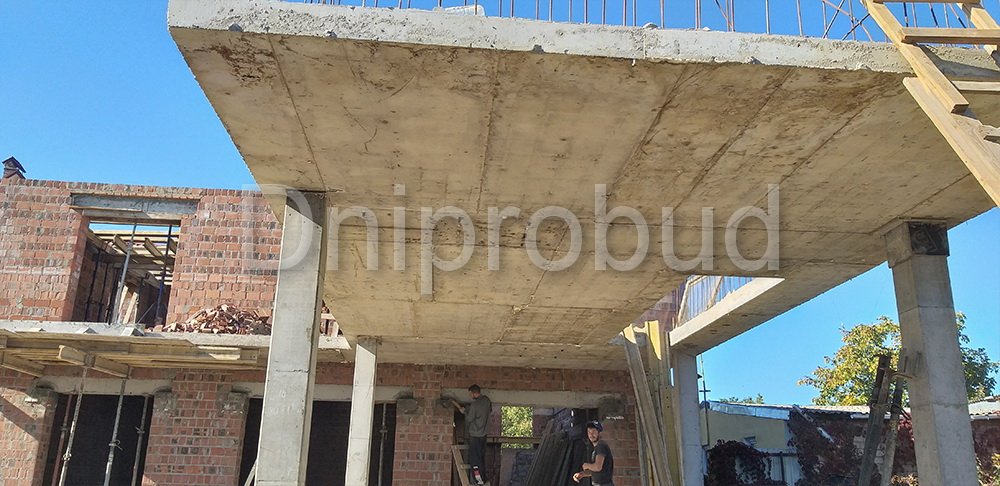 - Монолитное перекрытие второго этажа имеет большую выносную часть, расположенную над террасой первого этажа с опорой на четырех колоннах.