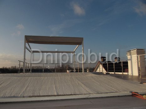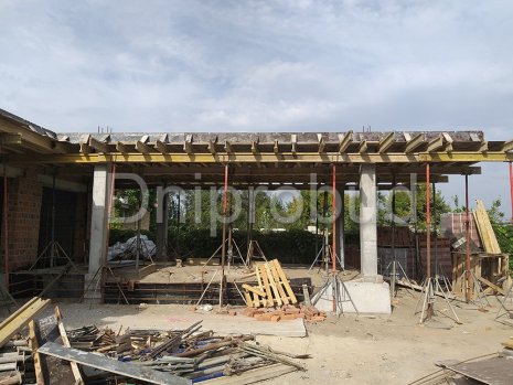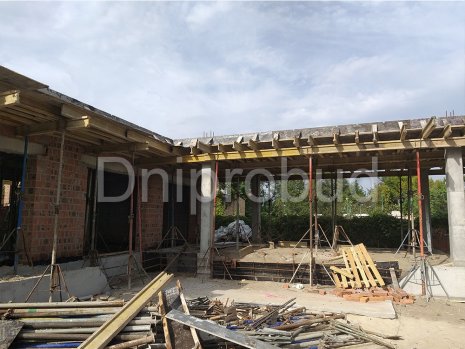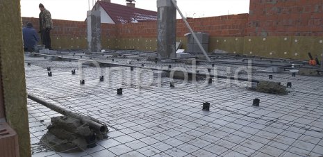 Конструктивная схема здания предполагает ленточный сборно-монолитный железобетонный фундамент: монолитная железобетонная подушка + 3 ряда фундаментных блоков, возведение несущих стен дома из керамического блока 2NF, монолитное междуэтажное перекрытие. Кровля дома - плоская. Кровельный пирог монтируется на монолитном бетонном перекрытии, пенополистирола, стяжки с разуклонкой из жесткого раствора, по которой укладывается слой геотекстиля и ПВХ мембраны.