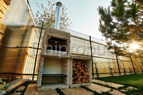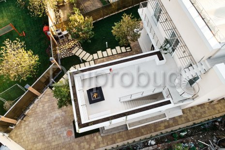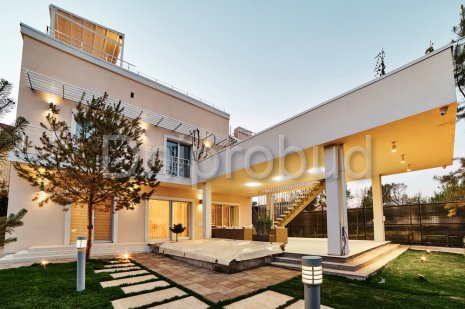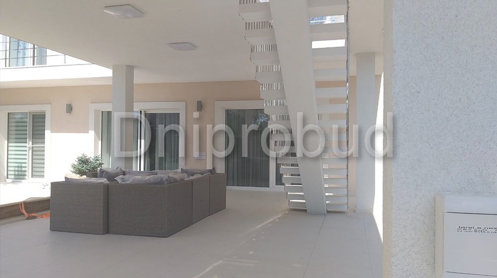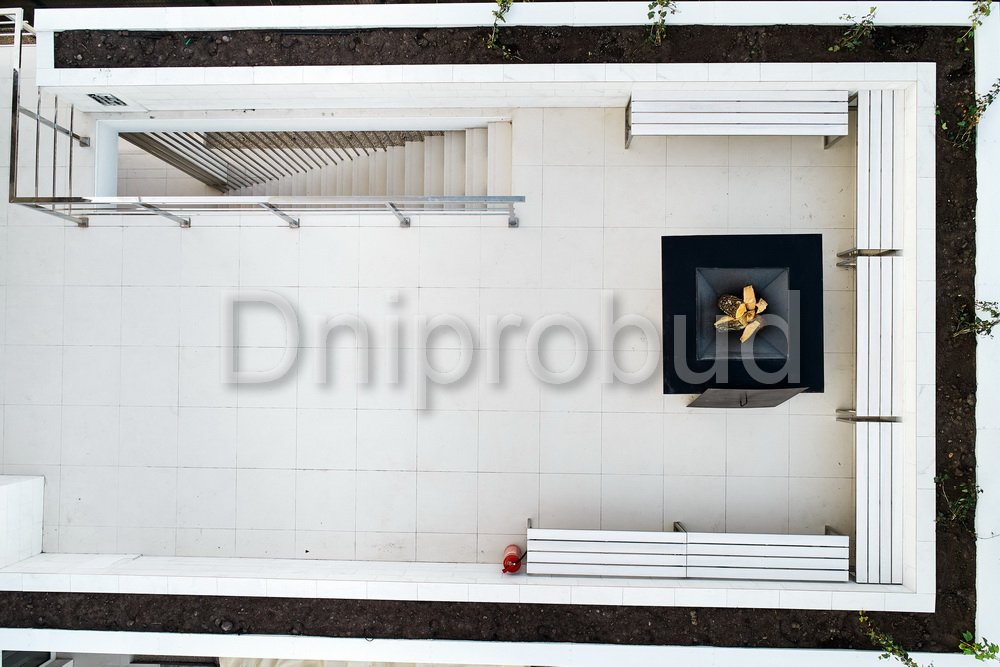 - Наличие 3 террас, расположенных в трёх уровнях: просторная крытая терраса на первом этаже, открытая терраса на уровне второго этажа, а также небольшая терраса-зона отдыха с бассейном на уровне третьего этажа.