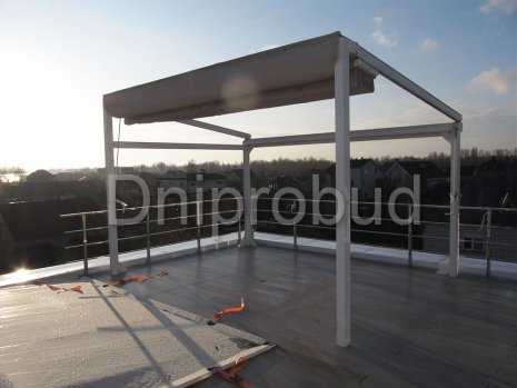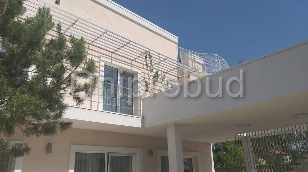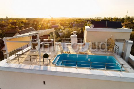 - Наличие двух бассейнов. Один бассейн расположен на уровне террасы 1-го этажа, второй бассейн по желанию заказчика был расположен на кровле 2-го этажа дома и вместе с ним была обустроена зона отдыха с навесом.