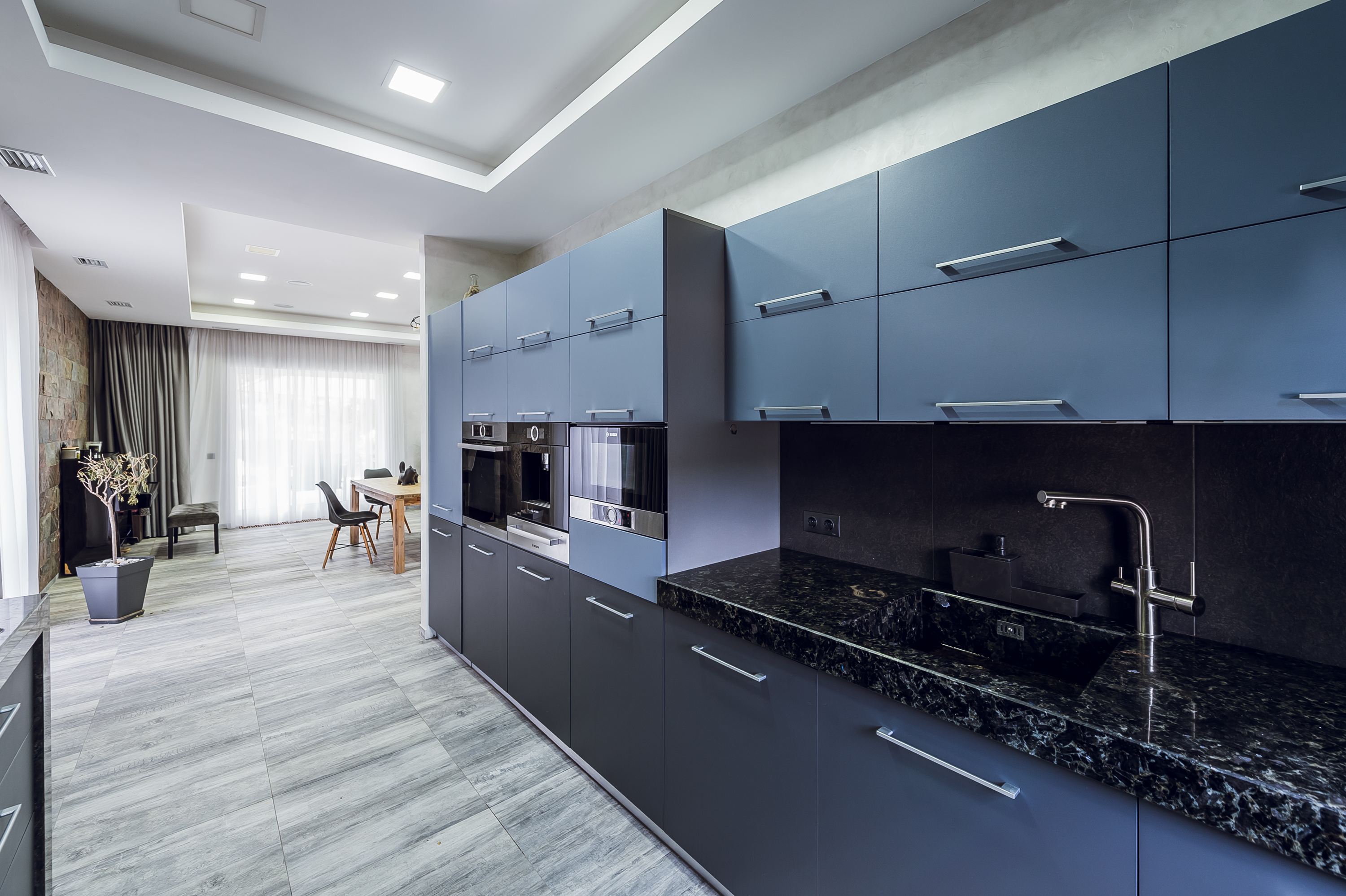 На первом этаже большая гостиная с камином на дровах, просторная кухня со встроенной техникой Bosch, кабинет и санузел.