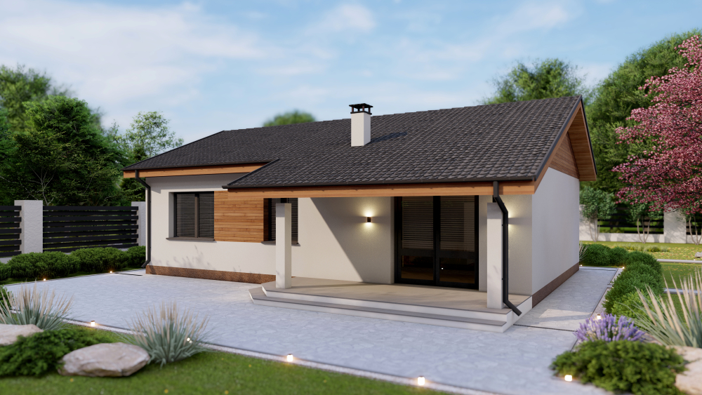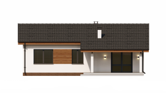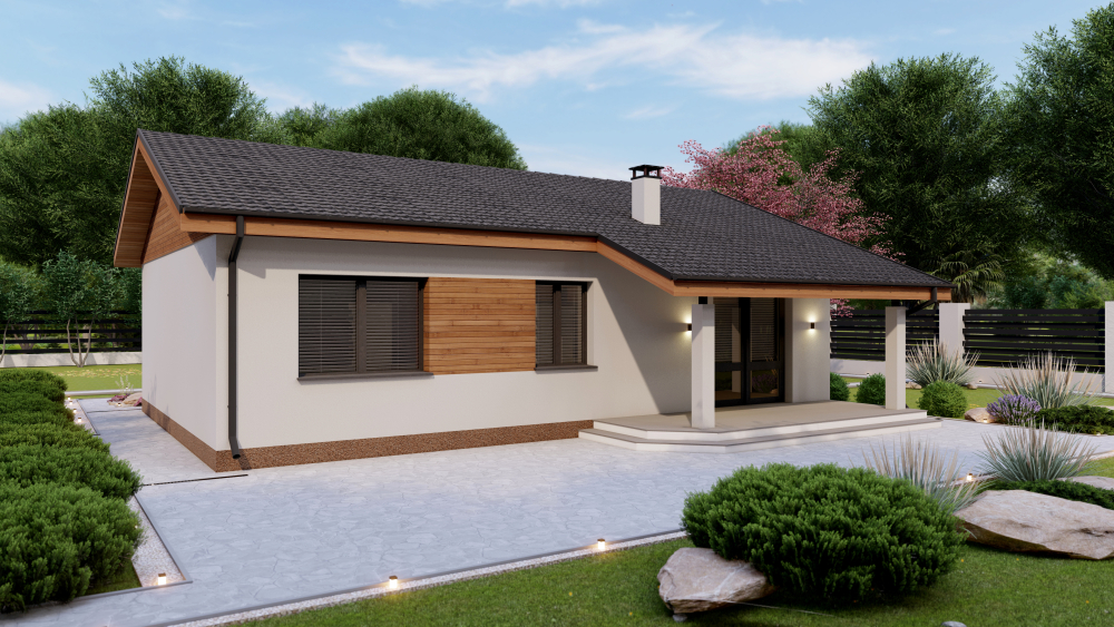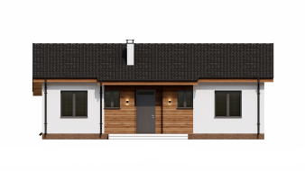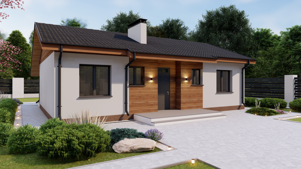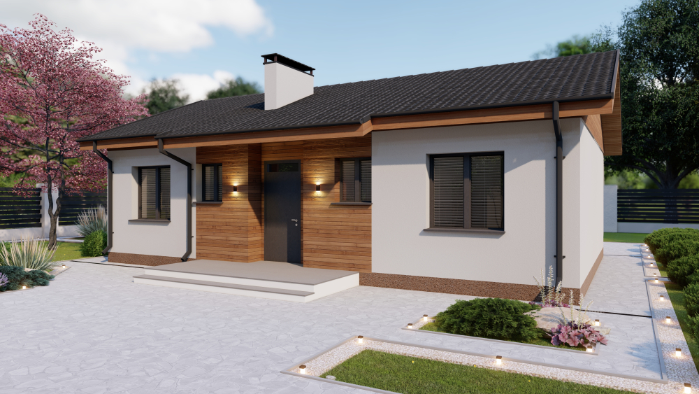 Проект DB14 от компании Dniprobud — это проект небольшого и экономичного одноэтажного дома с двускатной крышей.