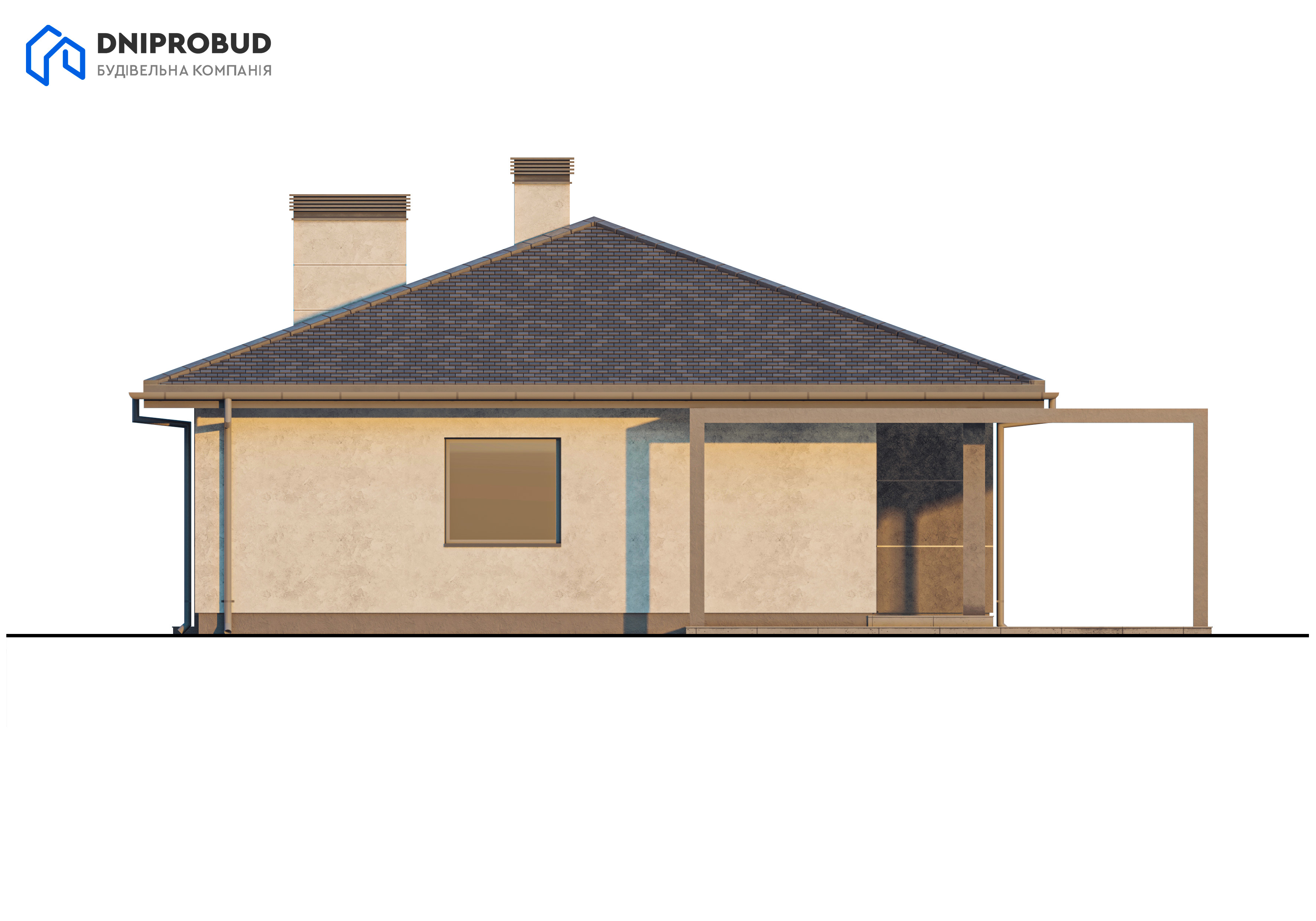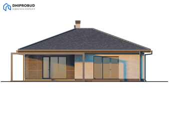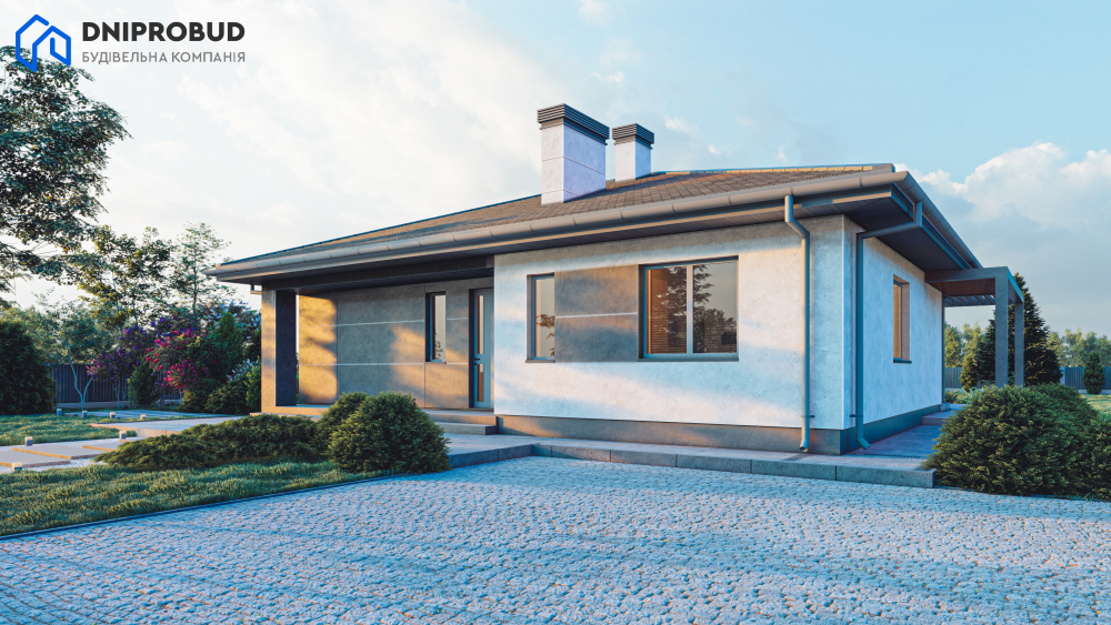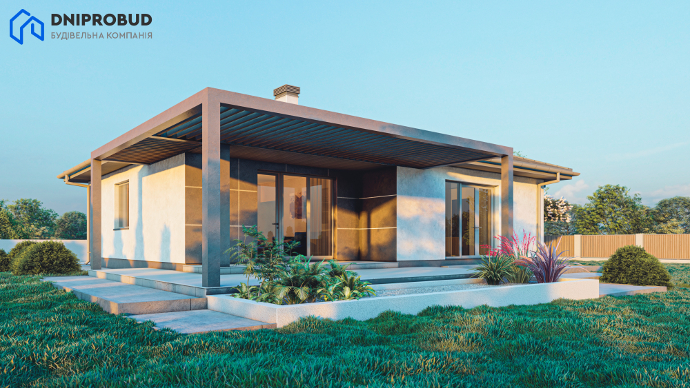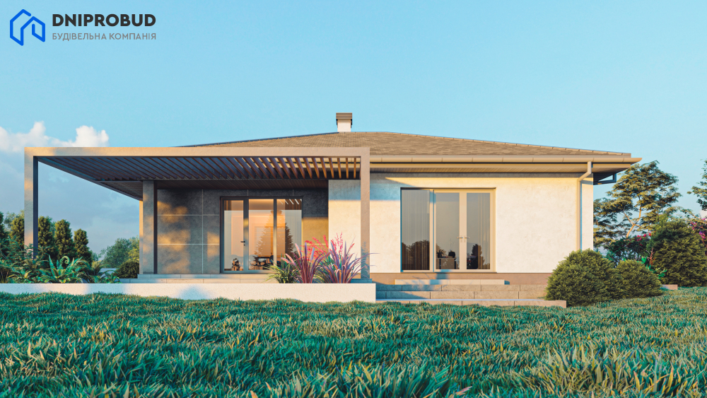 Проект является воплощением современного видения комфортной загородной жизни, реализованного в элегантном одноэтажном доме. Его архитектура отличается чёткими геометрическими формами и минималистичным подходом, где главное внимание уделено функциональности и эстетике. В отделке фасада гармонично сочетаются два контрастных материала: светлая декоративная штукатурка и большие панели насыщенного графитового цвета, что придаёт дому выразительный и динамичный вид. Завершает целостный образ четырёхскатная крыша тёмного оттенка с широкими свесами, дополненная двумя массивными светлыми дымоходами. Особую роль в проекте играет естественное освещение. Благодаря большим панорамным окнам и раздвижным стеклянным дверям внутреннее пространство дома наполняется солнечным светом, а граница между интерьером и окружающим ландшафтом становится почти незаметной. Настоящей жемчужиной проекта является просторная задняя терраса, частично накрытая стильной перголой. Она служит идеальным местом для семейного отдыха на свежем воздухе и уютных встреч с друзьями, фактически расширяя жилую зону в тёплое время года.