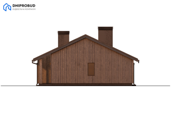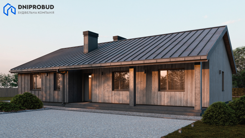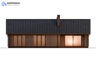 Одноэтажный коттедж в современном стиле, характеризующийся четкими линиями и природными материалами. Фасады полностью отделаны вертикальной деревянной вагонкой графитового цвета, что придает дому сдержанный и естественный вид. У дома двускатная крыша с темной фальцевой кровлей. Основной акцент сделан на большой крытой террасе, расположенной вдоль главного фасада, которая формируется за счет большого выноса крыши и поддерживается вертикальными деревянными столбами. На террасу ведет широкое панорамное остекление и раздвижные двери, объединяющие внутреннее пространство гостиной с внешней зоной отдыха.