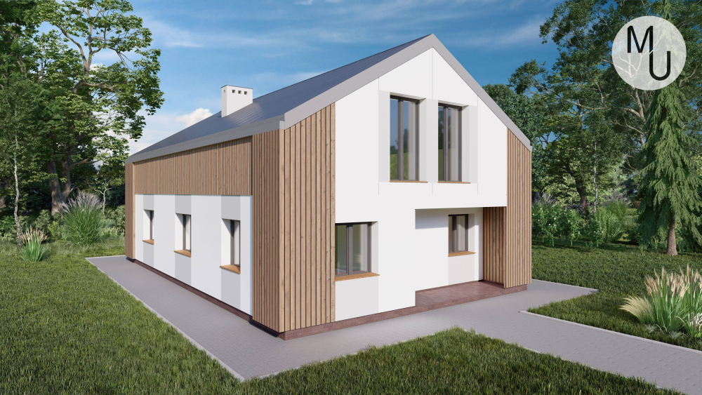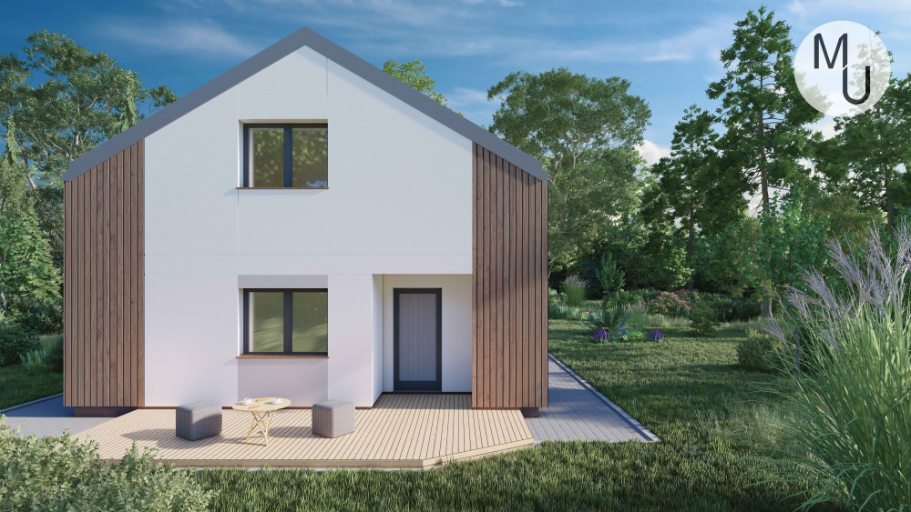 Компактный двухэтажный дом в современном стиле. Фасады выполнены из светлой штукатурки, контрастирующей с вертикальной деревянной облицовкой, которая придает ему естественность и теплоту. Двускатная крыша серого цвета завершает минималистичный образ. У дома есть небольшая открытая терраса на первом этаже, где можно обустроить зону отдыха.