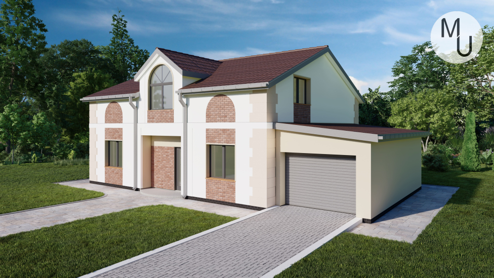 Комфортный двухэтажный дом в современном стиле, сочетающий белую штукатурку со светлыми акцентами и декоративную кирпичную кладку. Архитектурный акцент сделан на большом фронтоне с арочным окном, что придает зданию уникальный вид. У дома двускатная крыша из металлочерепицы и интегрированный гараж.