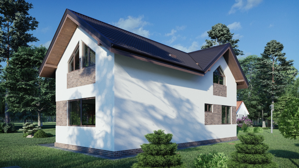 Двухэтажный дом с мансардой. Фасады выполнены в сочетании светлой штукатурки и декоративных кирпичей в теплых коричневых оттенках. Большие окна с деревянными рамами снабжают интерьер естественным освещением. Крыша четырехскатная, с покрытием из темной металлочерепицы, с открытыми деревянными карнизами. Акцент – на компактном крыльце с крышей на опорных колоннах и эркерных окнах, придающих объем фасаду.