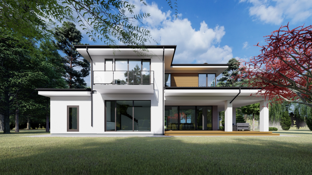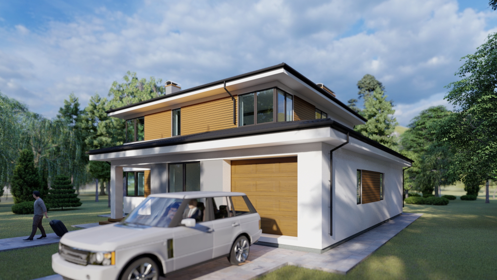 Современный двухэтажный коттедж с минималистичным дизайном, сочетающий белую и светло-серую штукатурку с деревянными акцентными вставками на втором этаже. У дома малоскатная крыша с выраженными карнизами и большое панорамное остекление, обеспечивающее много естественного света. Особенностью является просторная крытая терраса с белыми колоннами, охватывающая часть дома, где можно организовать летнюю гостиную и барбекю-зону. Проектом предусмотрен гараж на одно авто и уютное входное крыльцо.