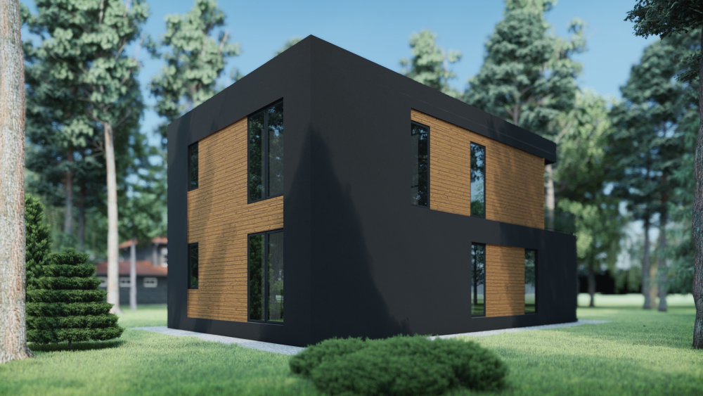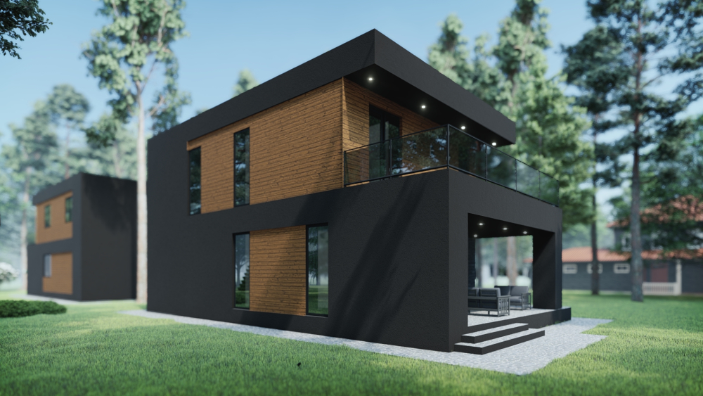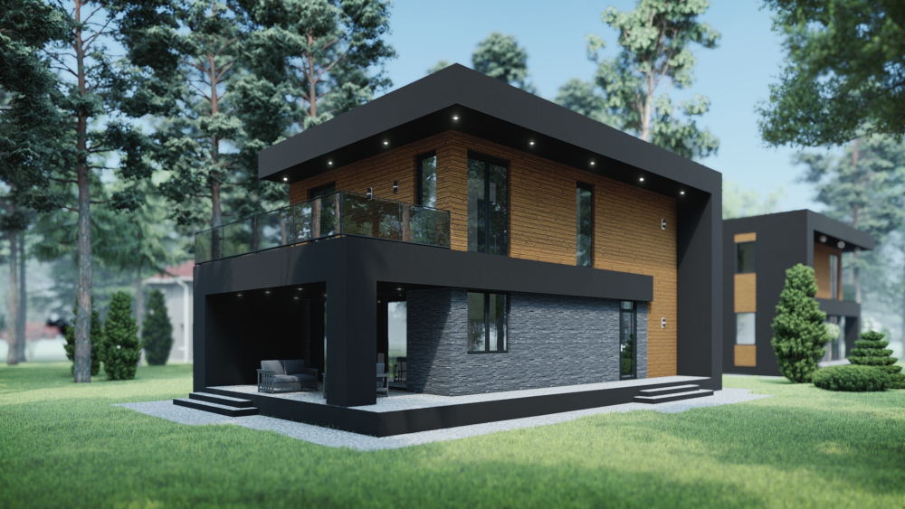 Современный двухэтажный коттедж с контрастной отделкой фасадов. Основной цвет – темно-серый, контрастирующий с большими вставками из натурального дерева. Дом имеет четкие геометрические формы, плоскую крышу, а также крытую террасу на первом этаже и открытый балкон с прозрачным стеклянным забором на втором этаже.