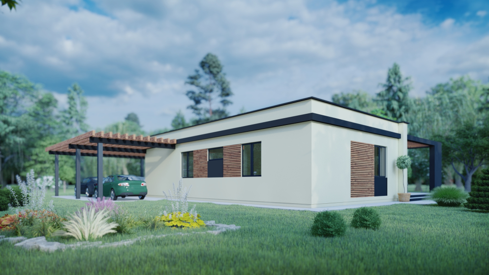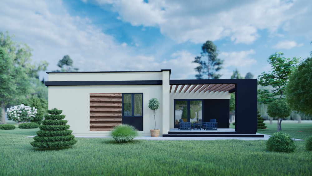 Современный одноэтажный дом с акцентом на функциональность и простоту форм. Фасады исполнены в светлых тонах с сочетанием декоративной штукатурки и деревянных элементов. Основной архитектурной особенностью является плоская крыша, подчеркивающая современный характер дома. Просторная гостиная с выходом на крытую террасу формирует зону для семейного отдыха.