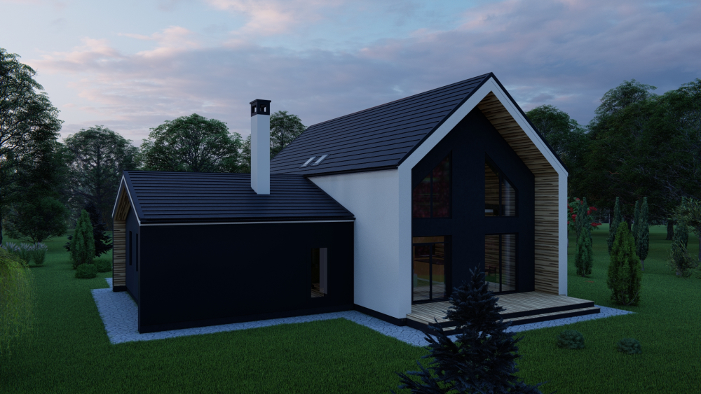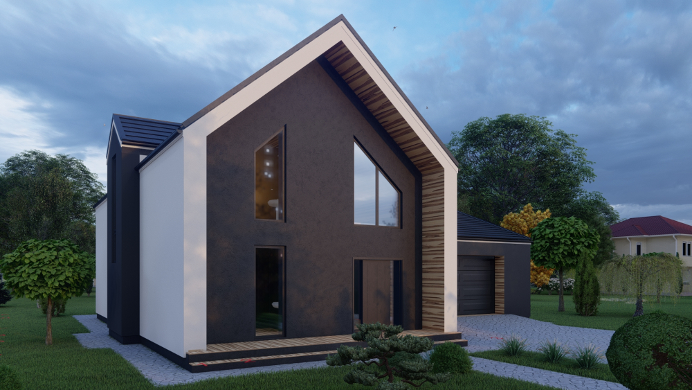 Двухэтажный дом с контрастным сочетанием белых и графитовых фасадов и теплыми деревянными акцентами в зонах под крышей. Большие панорамные окна на двух уровнях наполняют интерьер естественным светом и создают эффект открытого пространства. Прямые линии, двускатная крыша и интегрированный гараж на два автомобиля подчеркивают лаконичную и функциональную архитектуру.